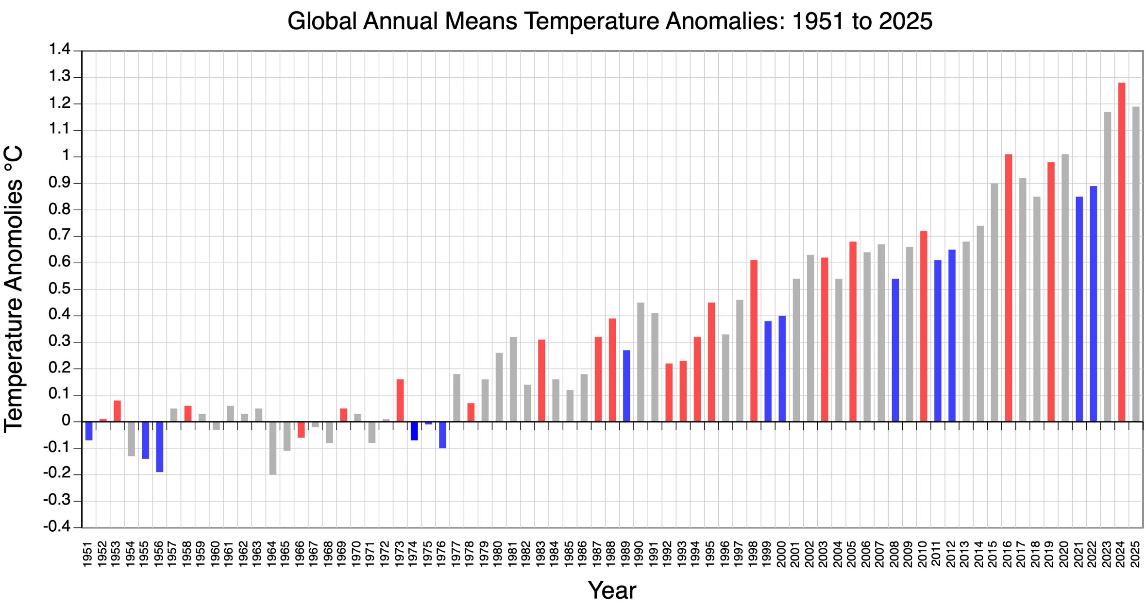 Figure 4 Global mean annual temperature anomalies for the period 1950-2025. Each yearly anomaly was calculated relative to the 1951 to 1980 average. This graph also shows whether the year was an El Niño or La Niña event. Image Copyright: Michael Pidwirny, Data Source: . http://data.giss.nasa.gov/gistemp/graphs_v4/.