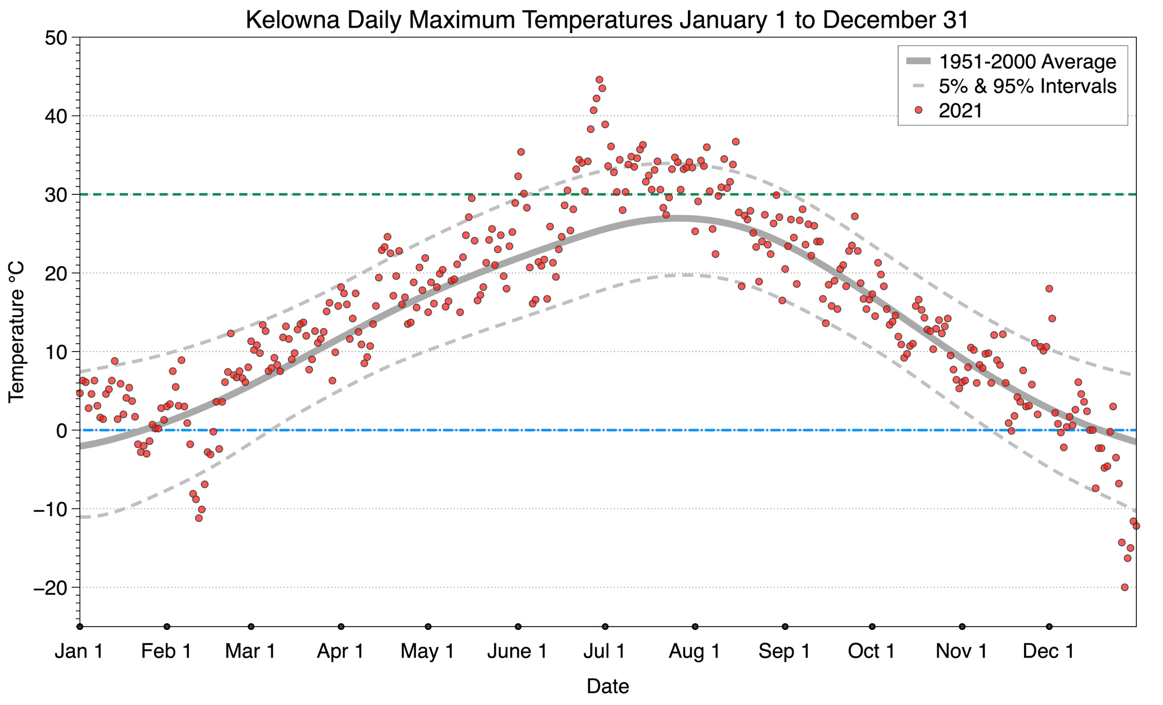 Figure 2 Plot of the daily maximum temperatures recorded in Kelowna from January 1 to December 31, 2021. The graph also includes the average daily temperature over the 50-year period from 1951 to 2000, represented by a dark grey thick line. The 5% and 95% probability intervals for 1951 to 2000 are depicted by dotted light grey lines.