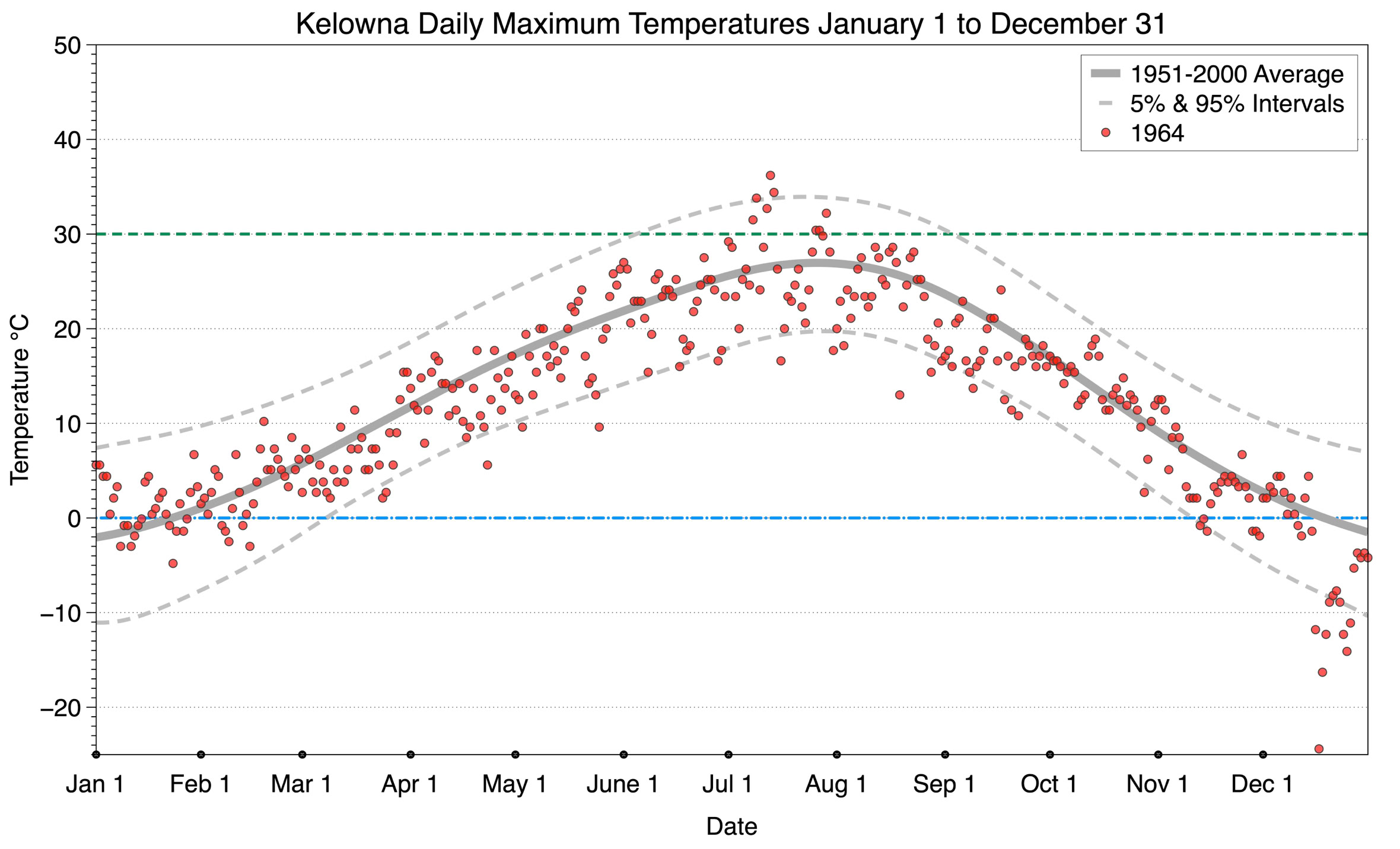 The graph below displays the day-to-day values of maximum daily temperature (red dots) at Kelowna for the year 1964. On this graph, the dark grey thick center line is the average daily temperature calculated from 50 years of data from 1951 to 2000. The dotted light grey lines are the 5% and 95% probability intervals - about 90% of the data from 1951 to 2000 fell within these boundaries. Daily temperatures can be considered as extreme cold or extreme hot events if they that fall outside the 5% or 95% probability intervals, respectively. In Canada, temperatures above 30°C (green dashed line) are considered extreme daily temperatures.