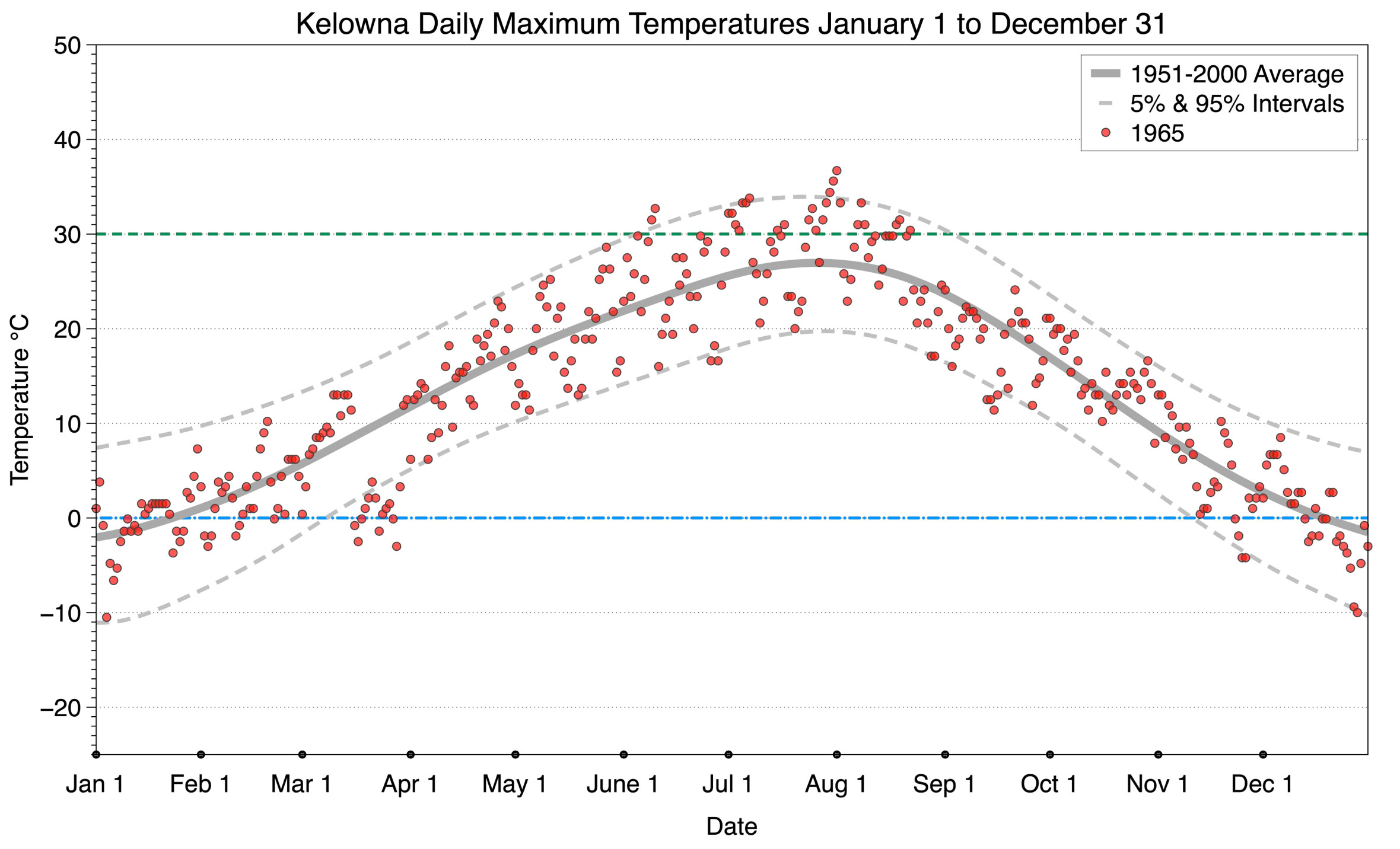 The graph below displays the day-to-day values of maximum daily temperature (red dots) at Kelowna for the year 1965. On this graph, the dark grey thick center line is the average daily temperature calculated from 50 years of data from 1951 to 2000. The dotted light grey lines are the 5% and 95% probability intervals - about 90% of the data from 1951 to 2000 fell within these boundaries. Daily temperatures can be considered as extreme cold or extreme hot events if they that fall outside the 5% or 95% probability intervals, respectively. In Canada, temperatures above 30°C (green dashed line) are considered extreme daily temperatures.