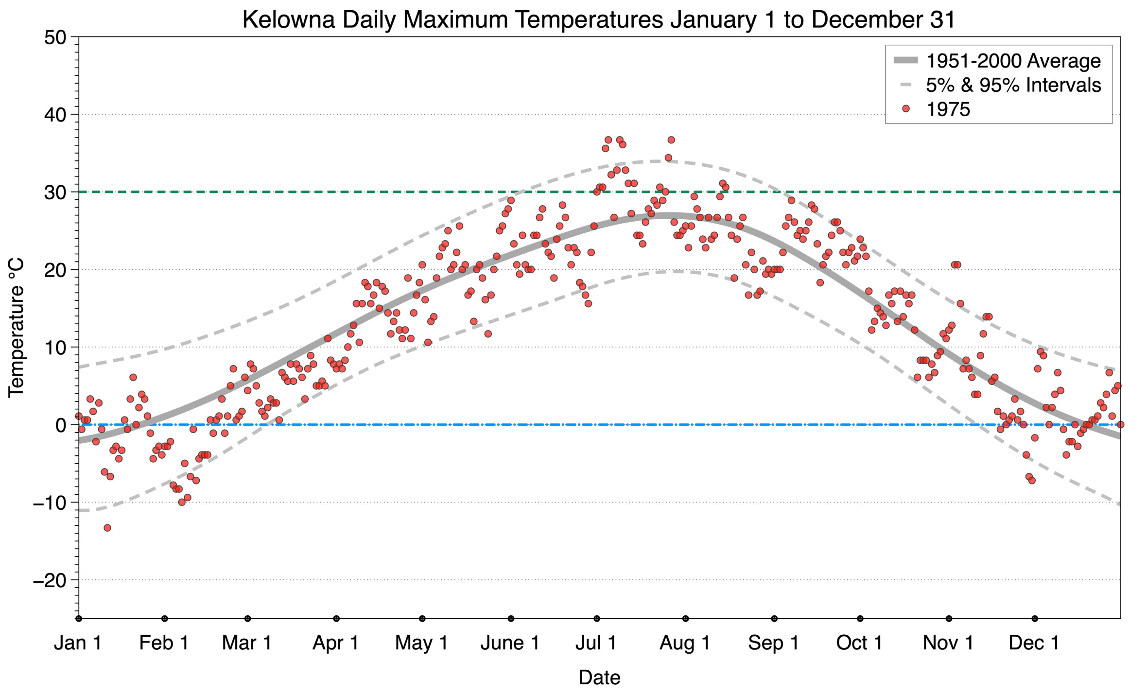 The graph below displays the day-to-day values of maximum daily temperature (red dots) at Kelowna for the year 1975. On this graph, the dark grey thick center line is the average daily temperature calculated from 50 years of data from 1951 to 2000. The dotted light grey lines are the 5% and 95% probability intervals - about 90% of the data from 1951 to 2000 fell within these boundaries. Daily temperatures can be considered as extreme cold or extreme hot events if they that fall outside the 5% or 95% probability intervals, respectively. In Canada, temperatures above 30°C (green dashed line) are considered extreme daily temperatures.