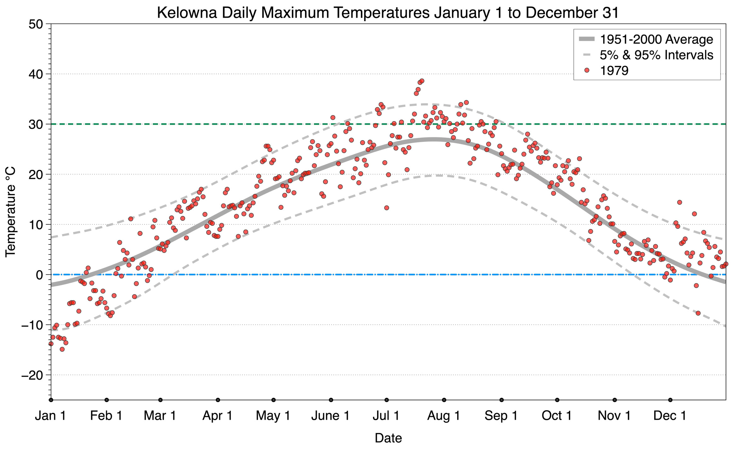 The graph below displays the day-to-day values of maximum daily temperature (red dots) at Kelowna for the year 1979. On this graph, the dark grey thick center line is the average daily temperature calculated from 50 years of data from 1951 to 2000. The dotted light grey lines are the 5% and 95% probability intervals - about 90% of the data from 1951 to 2000 fell within these boundaries. Daily temperatures can be considered as extreme cold or extreme hot events if they that fall outside the 5% or 95% probability intervals, respectively. In Canada, temperatures above 30°C (green dashed line) are considered extreme daily temperatures.