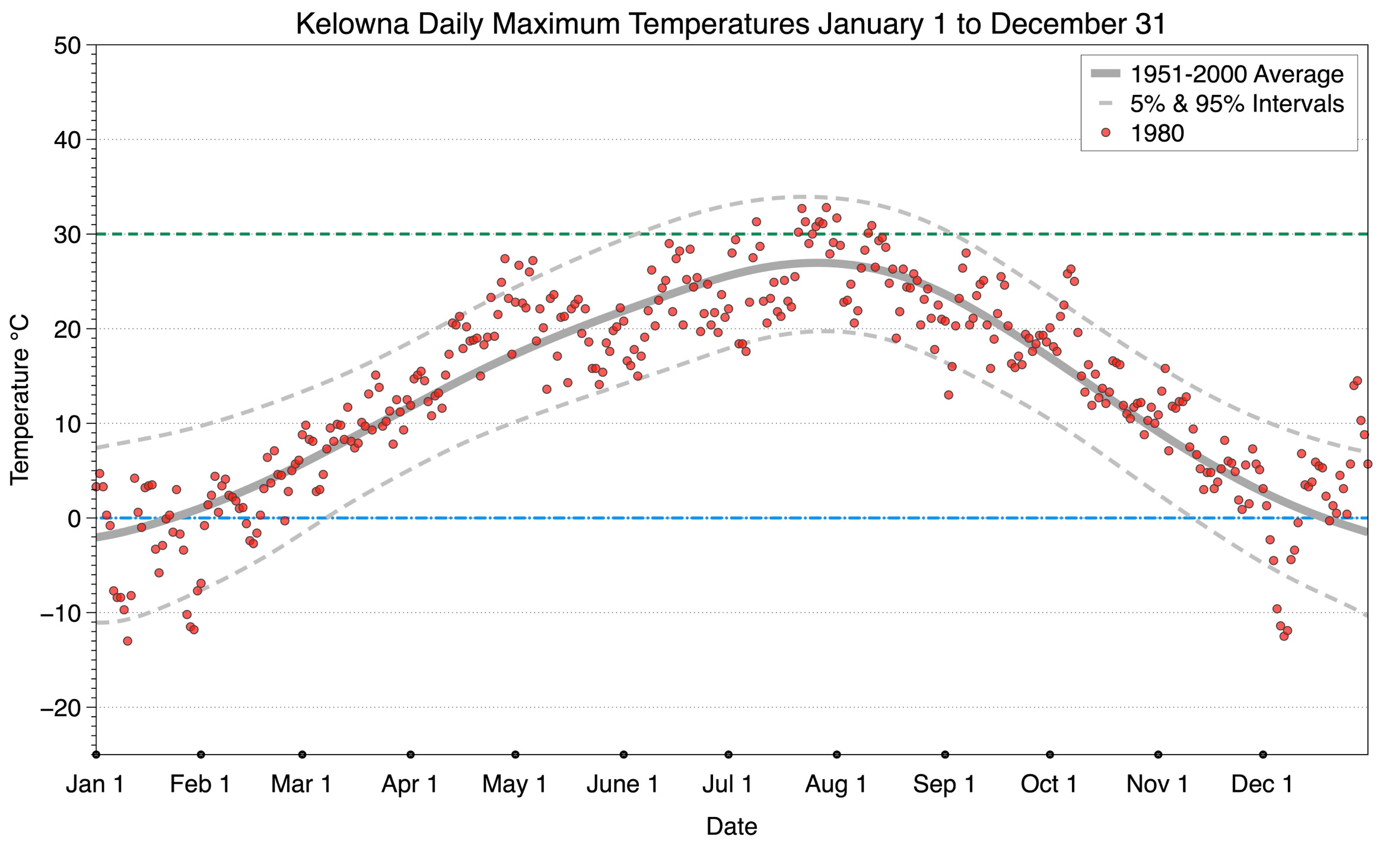 The graph below displays the day-to-day values of maximum daily temperature (red dots) at Kelowna for the year 1980. On this graph, the dark grey thick center line is the average daily temperature calculated from 50 years of data from 1951 to 2000. The dotted light grey lines are the 5% and 95% probability intervals - about 90% of the data from 1951 to 2000 fell within these boundaries. Daily temperatures can be considered as extreme cold or extreme hot events if they that fall outside the 5% or 95% probability intervals, respectively. In Canada, temperatures above 30°C (green dashed line) are considered extreme daily temperatures.