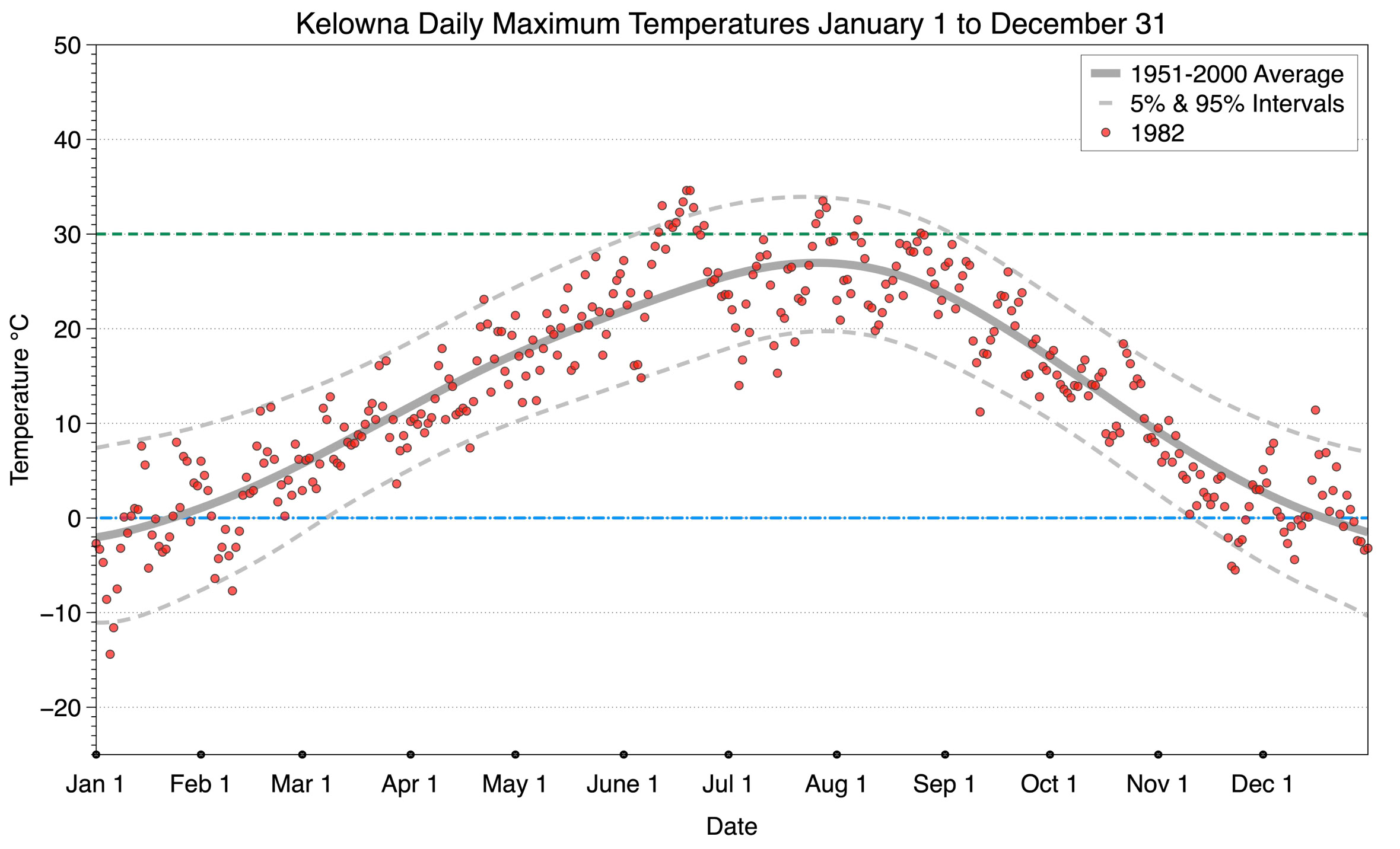 The graph below displays the day-to-day values of maximum daily temperature (red dots) at Kelowna for the year 1982. On this graph, the dark grey thick center line is the average daily temperature calculated from 50 years of data from 1951 to 2000. The dotted light grey lines are the 5% and 95% probability intervals - about 90% of the data from 1951 to 2000 fell within these boundaries. Daily temperatures can be considered as extreme cold or extreme hot events if they that fall outside the 5% or 95% probability intervals, respectively. In Canada, temperatures above 30°C (green dashed line) are considered extreme daily temperatures.