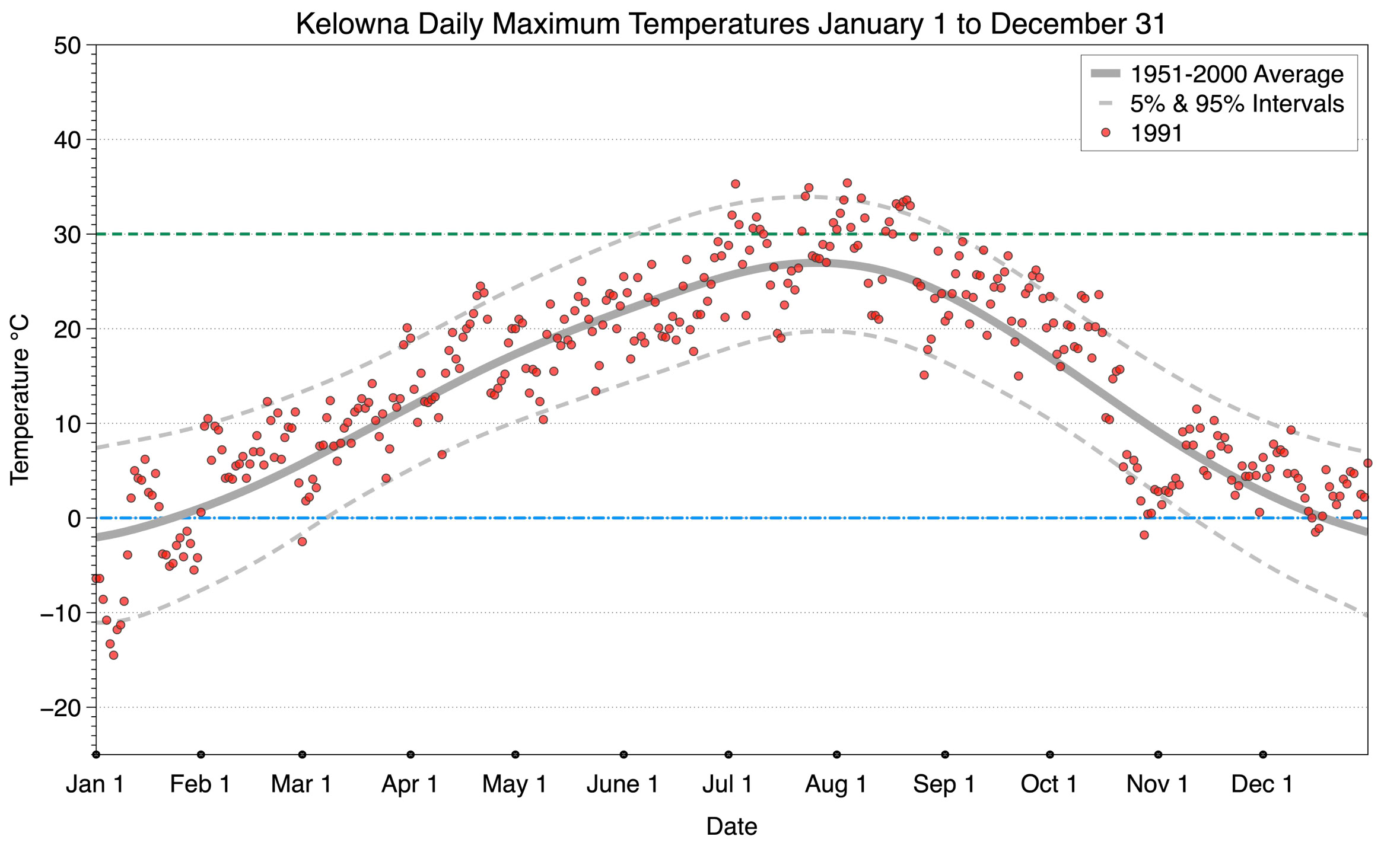 The graph below displays the day-to-day values of maximum daily temperature (red dots) at Kelowna for the year 1991. On this graph, the dark grey thick center line is the average daily temperature calculated from 50 years of data from 1951 to 2000. The dotted light grey lines are the 5% and 95% probability intervals - about 90% of the data from 1951 to 2000 fell within these boundaries. Daily temperatures can be considered as extreme cold or extreme hot events if they that fall outside the 5% or 95% probability intervals, respectively. In Canada, temperatures above 30°C (green dashed line) are considered extreme daily temperatures.
