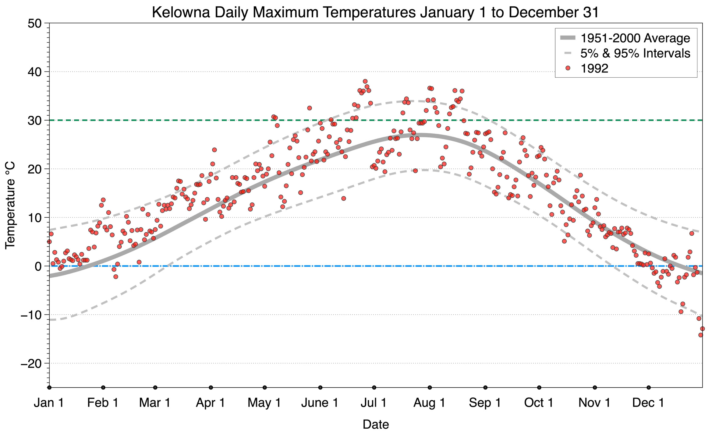 The graph below displays the day-to-day values of maximum daily temperature (red dots) at Kelowna for the year 1992. On this graph, the dark grey thick center line is the average daily temperature calculated from 50 years of data from 1951 to 2000. The dotted light grey lines are the 5% and 95% probability intervals - about 90% of the data from 1951 to 2000 fell within these boundaries. Daily temperatures can be considered as extreme cold or extreme hot events if they that fall outside the 5% or 95% probability intervals, respectively. In Canada, temperatures above 30°C (green dashed line) are considered extreme daily temperatures.