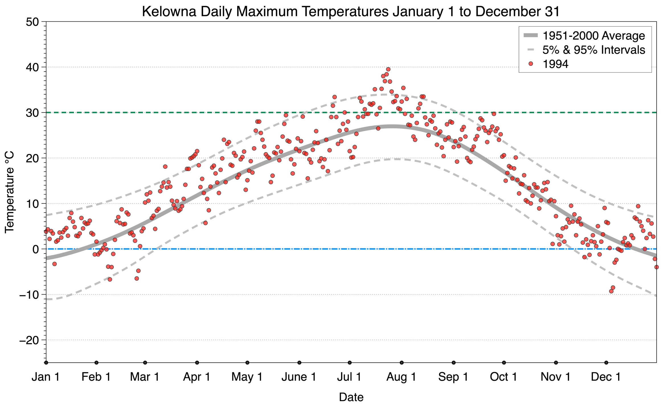 The graph below displays the day-to-day values of maximum daily temperature (red dots) at Kelowna for the year 1994. On this graph, the dark grey thick center line is the average daily temperature calculated from 50 years of data from 1951 to 2000. The dotted light grey lines are the 5% and 95% probability intervals - about 90% of the data from 1951 to 2000 fell within these boundaries. Daily temperatures can be considered as extreme cold or extreme hot events if they that fall outside the 5% or 95% probability intervals, respectively. In Canada, temperatures above 30°C (green dashed line) are considered extreme daily temperatures.