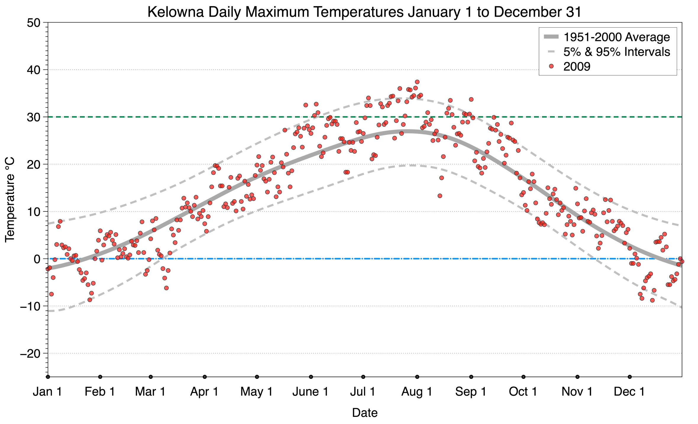 The graph below displays the day-to-day values of maximum daily temperature (red dots) at Kelowna for the year 2009. On this graph, the dark grey thick center line is the average daily temperature calculated from 50 years of data from 1951 to 2000. The dotted light grey lines are the 5% and 95% probability intervals - about 90% of the data from 1951 to 2000 fell within these boundaries. Daily temperatures can be considered as extreme cold or extreme hot events if they that fall outside the 5% or 95% probability intervals, respectively. In Canada, temperatures above 30°C (green dashed line) are considered extreme daily temperatures.
