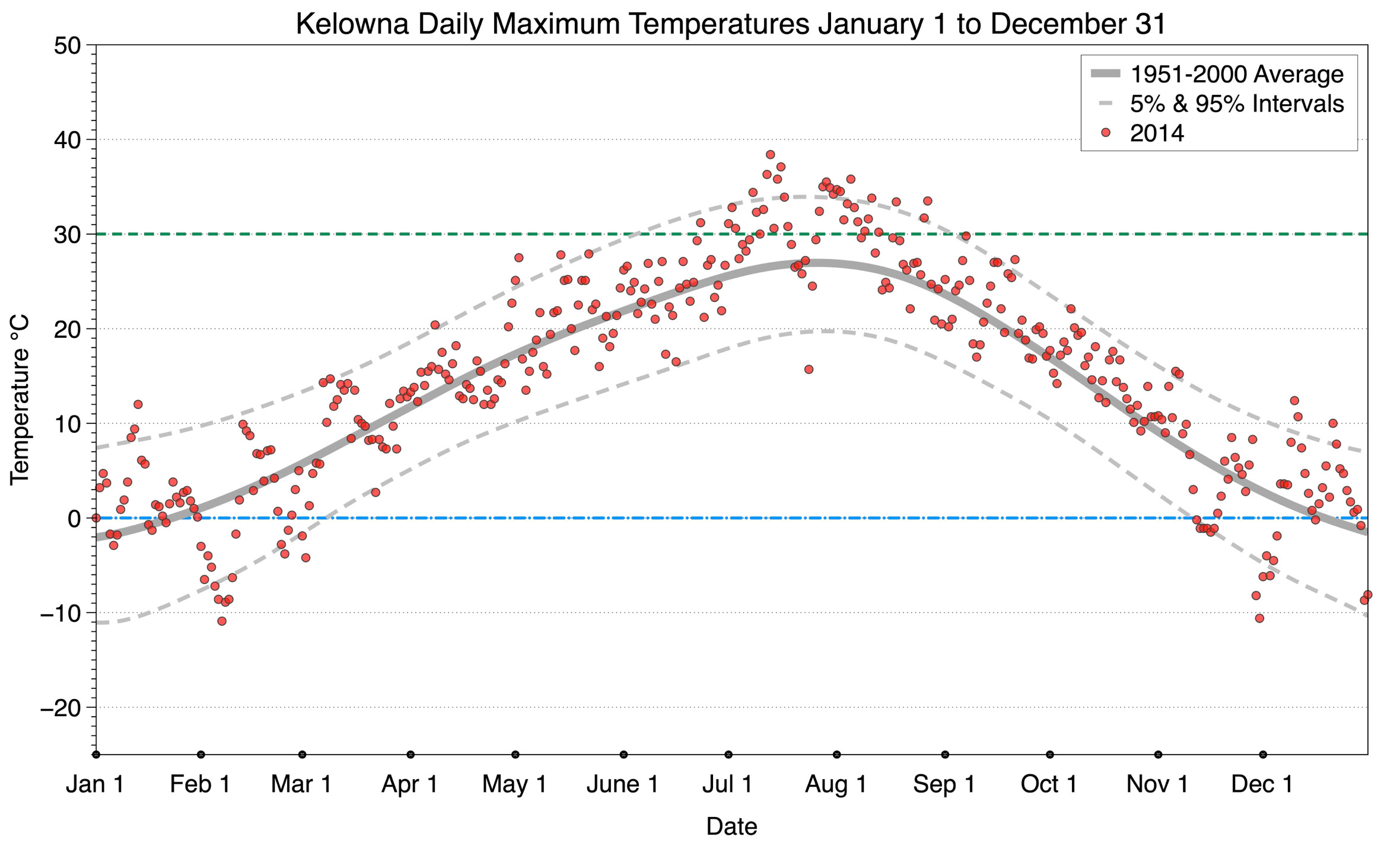 The graph below displays the day-to-day values of maximum daily temperature (red dots) at Kelowna for the year 2014. On this graph, the dark grey thick center line is the average daily temperature calculated from 50 years of data from 1951 to 2000. The dotted light grey lines are the 5% and 95% probability intervals - about 90% of the data from 1951 to 2000 fell within these boundaries. Daily temperatures can be considered as extreme cold or extreme hot events if they that fall outside the 5% or 95% probability intervals, respectively. In Canada, temperatures above 30°C (green dashed line) are considered extreme daily temperatures.
