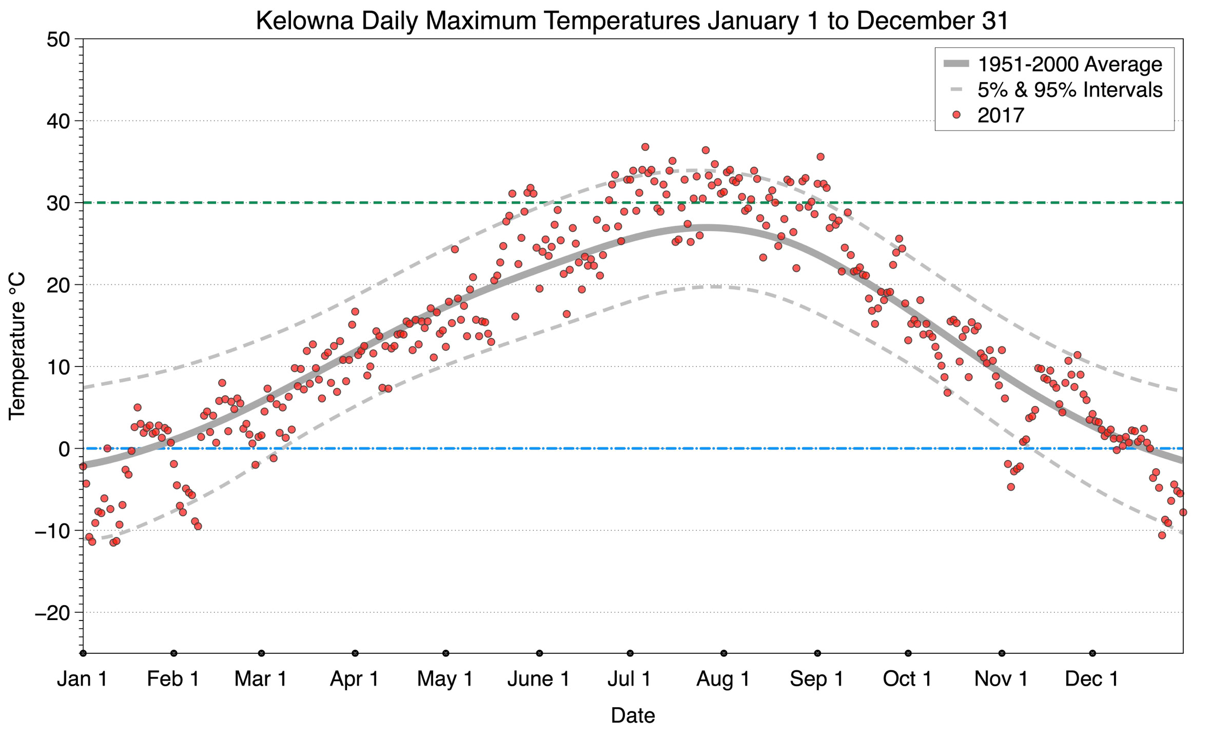 The graph below displays the day-to-day values of maximum daily temperature (red dots) at Kelowna for the year 2017. On this graph, the dark grey thick center line is the average daily temperature calculated from 50 years of data from 1951 to 2000. The dotted light grey lines are the 5% and 95% probability intervals - about 90% of the data from 1951 to 2000 fell within these boundaries. Daily temperatures can be considered as extreme cold or extreme hot events if they that fall outside the 5% or 95% probability intervals, respectively. In Canada, temperatures above 30°C (green dashed line) are considered extreme daily temperatures.