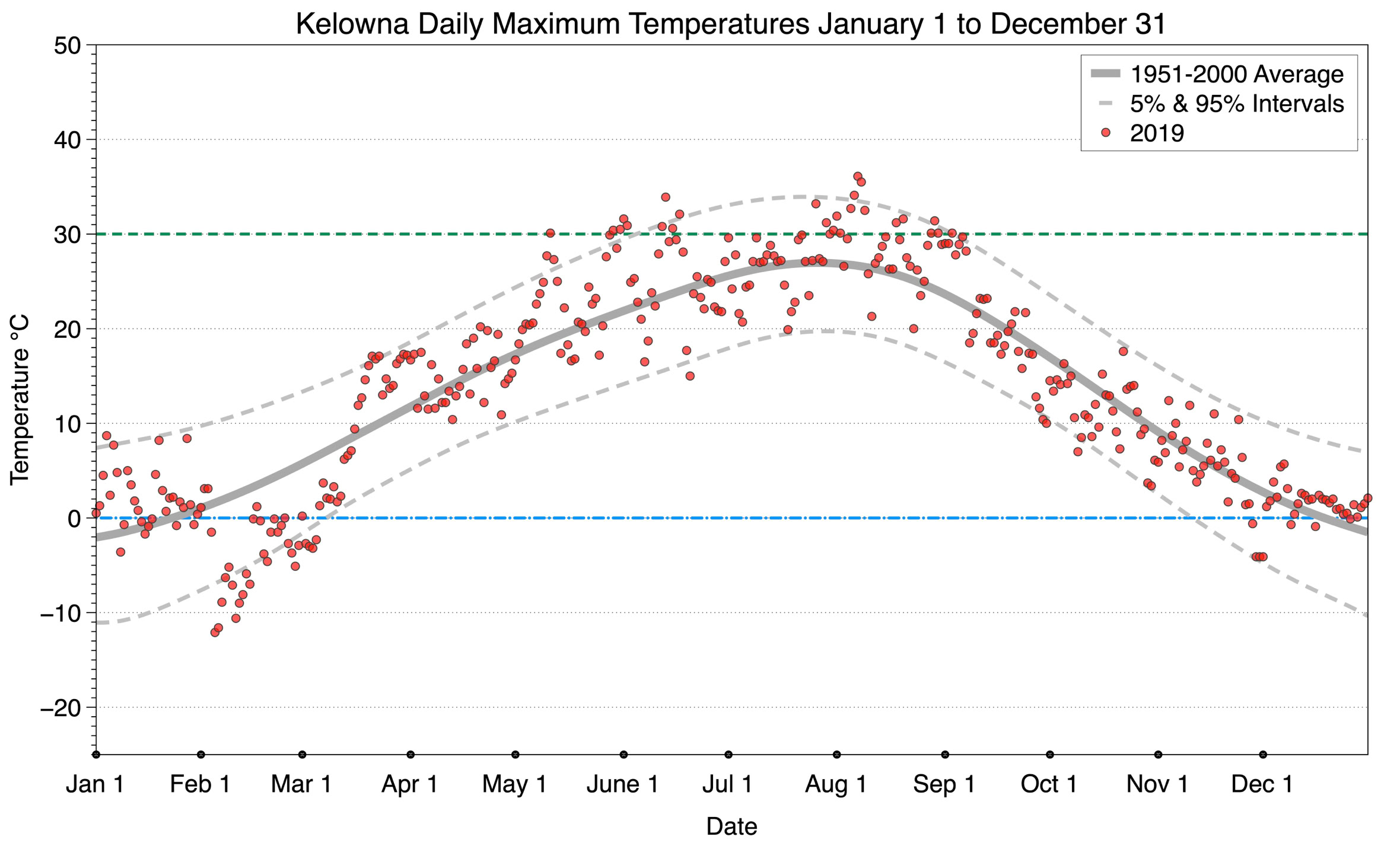 The graph below displays the day-to-day values of maximum daily temperature (red dots) at Kelowna for the year 2019. On this graph, the dark grey thick center line is the average daily temperature calculated from 50 years of data from 1951 to 2000. The dotted light grey lines are the 5% and 95% probability intervals - about 90% of the data from 1951 to 2000 fell within these boundaries. Daily temperatures can be considered as extreme cold or extreme hot events if they that fall outside the 5% or 95% probability intervals, respectively. In Canada, temperatures above 30°C (green dashed line) are considered extreme daily temperatures.