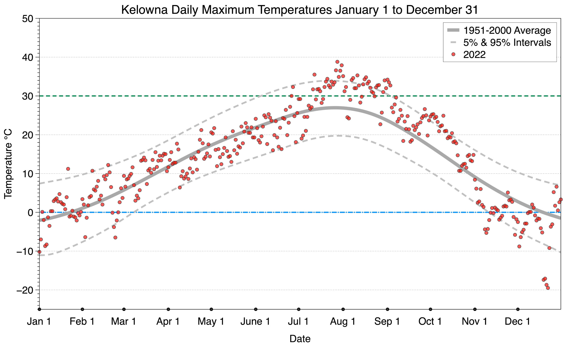 The graph below displays the day-to-day values of maximum daily temperature (red dots) at Kelowna for the year 2022. On this graph, the dark grey thick center line is the average daily temperature calculated from 50 years of data from 1951 to 2000. The dotted light grey lines are the 5% and 95% probability intervals - about 90% of the data from 1951 to 2000 fell within these boundaries. Daily temperatures can be considered as extreme cold or extreme hot events if they that fall outside the 5% or 95% probability intervals, respectively. In Canada, temperatures above 30°C (green dashed line) are considered extreme daily temperatures.