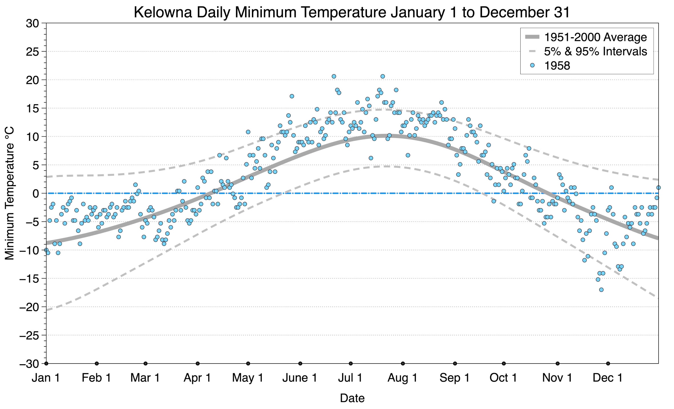 The graph below displays the day-to-day values of minimum daily temperature (blue dots) at Kelowna for the year 1958. On this graph, the dark grey thick center line is the average daily temperature calculated from 50 years of data from 1951 to 2000. The dotted light grey lines are the 5% and 95% probability intervals - about 90% of the data from 1951 to 2000 fell within these boundaries. Daily temperatures can be considered as extreme cold or extreme hot events if they that fall outside the 5% or 95% probability intervals, respectively.