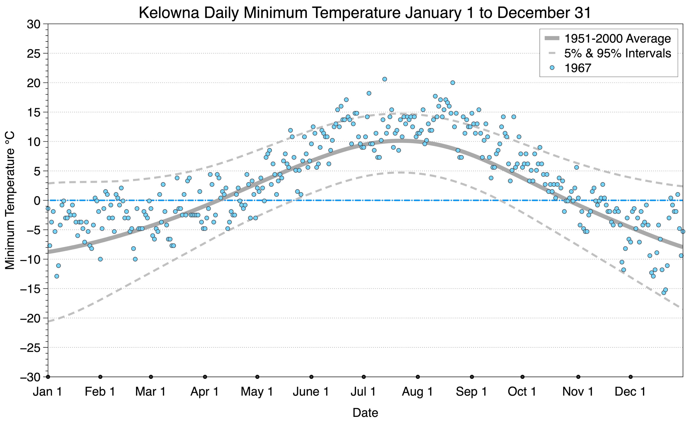 The graph below displays the day-to-day values of minimum daily temperature (blue dots) at Kelowna for the year 1967. On this graph, the dark grey thick center line is the average daily temperature calculated from 50 years of data from 1951 to 2000. The dotted light grey lines are the 5% and 95% probability intervals - about 90% of the data from 1951 to 2000 fell within these boundaries. Daily temperatures can be considered as extreme cold or extreme hot events if they that fall outside the 5% or 95% probability intervals, respectively.