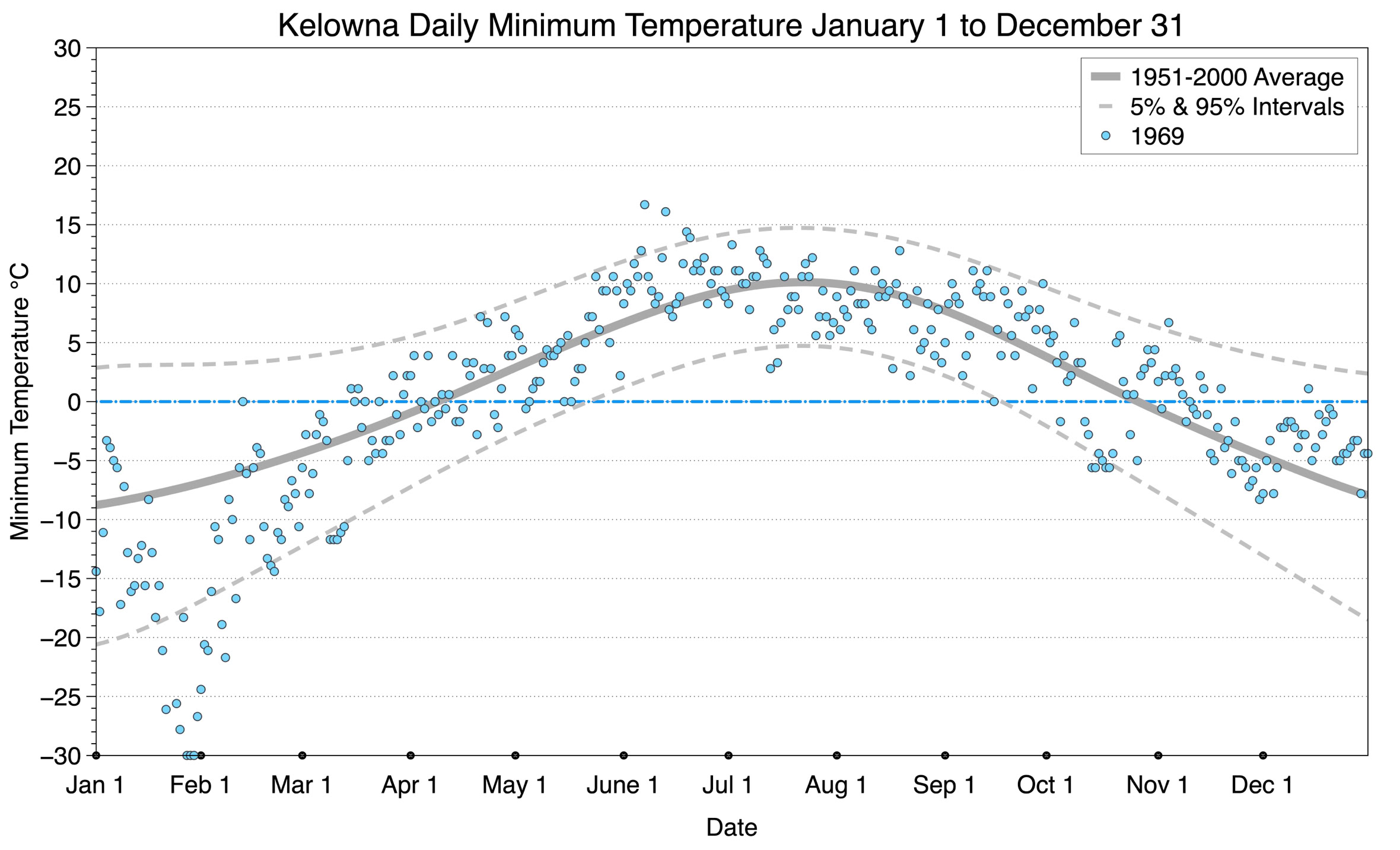 The graph below displays the day-to-day values of minimum daily temperature (blue dots) at Kelowna for the year 1969. On this graph, the dark grey thick center line is the average daily temperature calculated from 50 years of data from 1951 to 2000. The dotted light grey lines are the 5% and 95% probability intervals - about 90% of the data from 1951 to 2000 fell within these boundaries. Daily temperatures can be considered as extreme cold or extreme hot events if they that fall outside the 5% or 95% probability intervals, respectively.