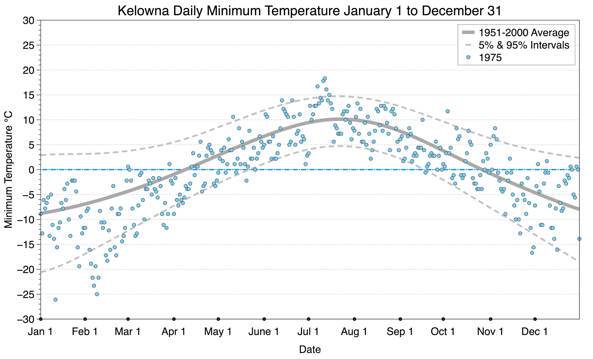 The graph below displays the day-to-day values of minimum daily temperature (blue dots) at Kelowna for the year 1975. On this graph, the dark grey thick center line is the average daily temperature calculated from 50 years of data from 1951 to 2000. The dotted light grey lines are the 5% and 95% probability intervals - about 90% of the data from 1951 to 2000 fell within these boundaries. Daily temperatures can be considered as extreme cold or extreme hot events if they that fall outside the 5% or 95% probability intervals, respectively.