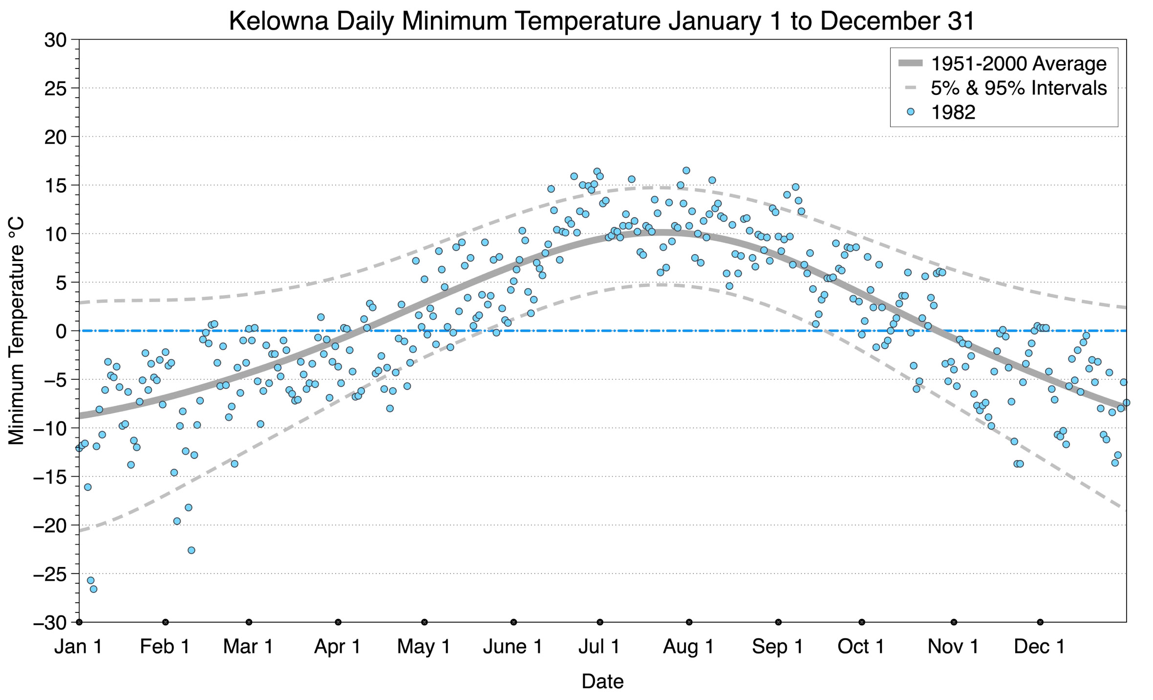 The graph below displays the day-to-day values of minimum daily temperature (blue dots) at Kelowna for the year 1982. On this graph, the dark grey thick center line is the average daily temperature calculated from 50 years of data from 1951 to 2000. The dotted light grey lines are the 5% and 95% probability intervals - about 90% of the data from 1951 to 2000 fell within these boundaries. Daily temperatures can be considered as extreme cold or extreme hot events if they that fall outside the 5% or 95% probability intervals, respectively.