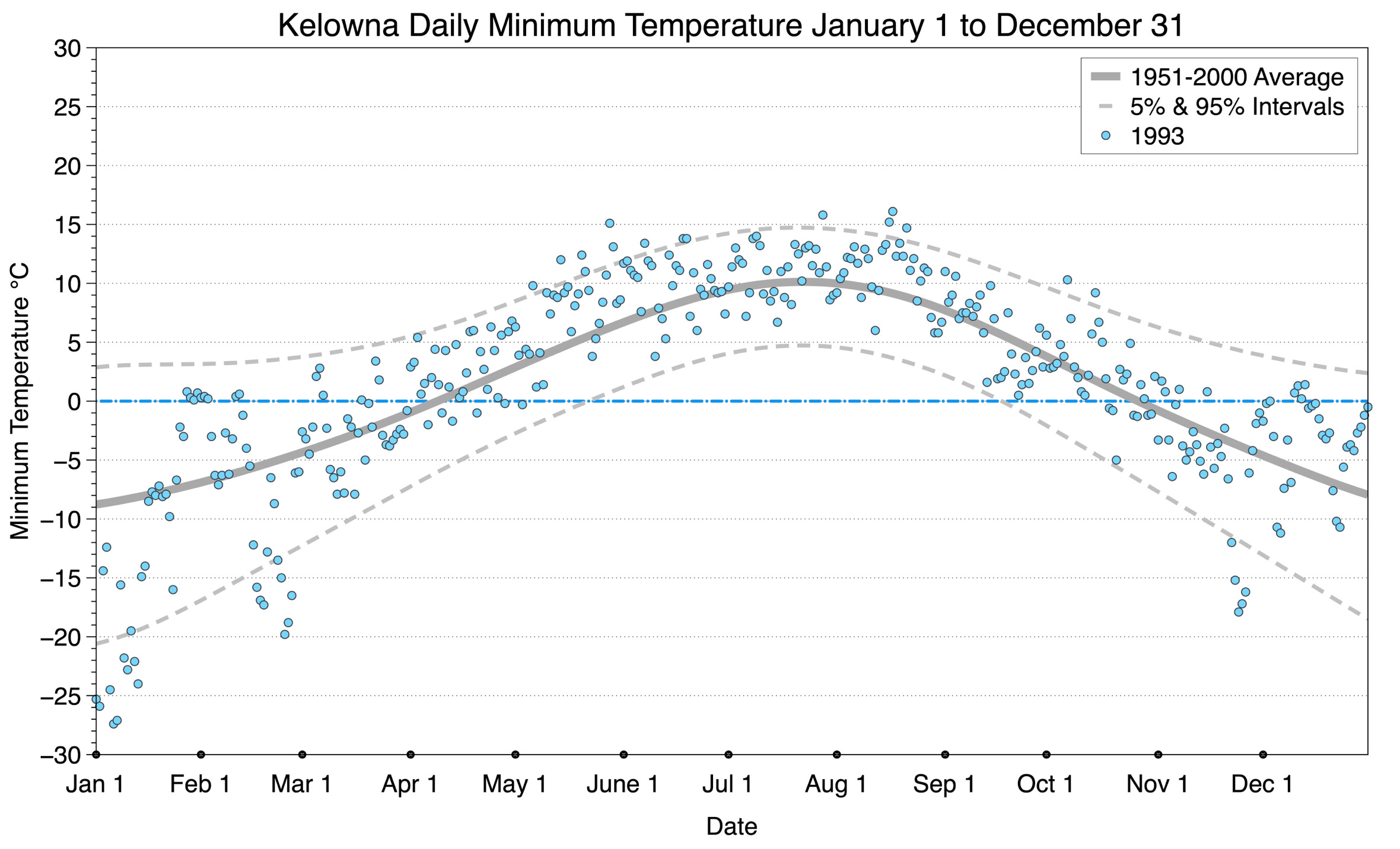 The graph below displays the day-to-day values of minimum daily temperature (blue dots) at Kelowna for the year 1993. On this graph, the dark grey thick center line is the average daily temperature calculated from 50 years of data from 1951 to 2000. The dotted light grey lines are the 5% and 95% probability intervals - about 90% of the data from 1951 to 2000 fell within these boundaries. Daily temperatures can be considered as extreme cold or extreme hot events if they that fall outside the 5% or 95% probability intervals, respectively.