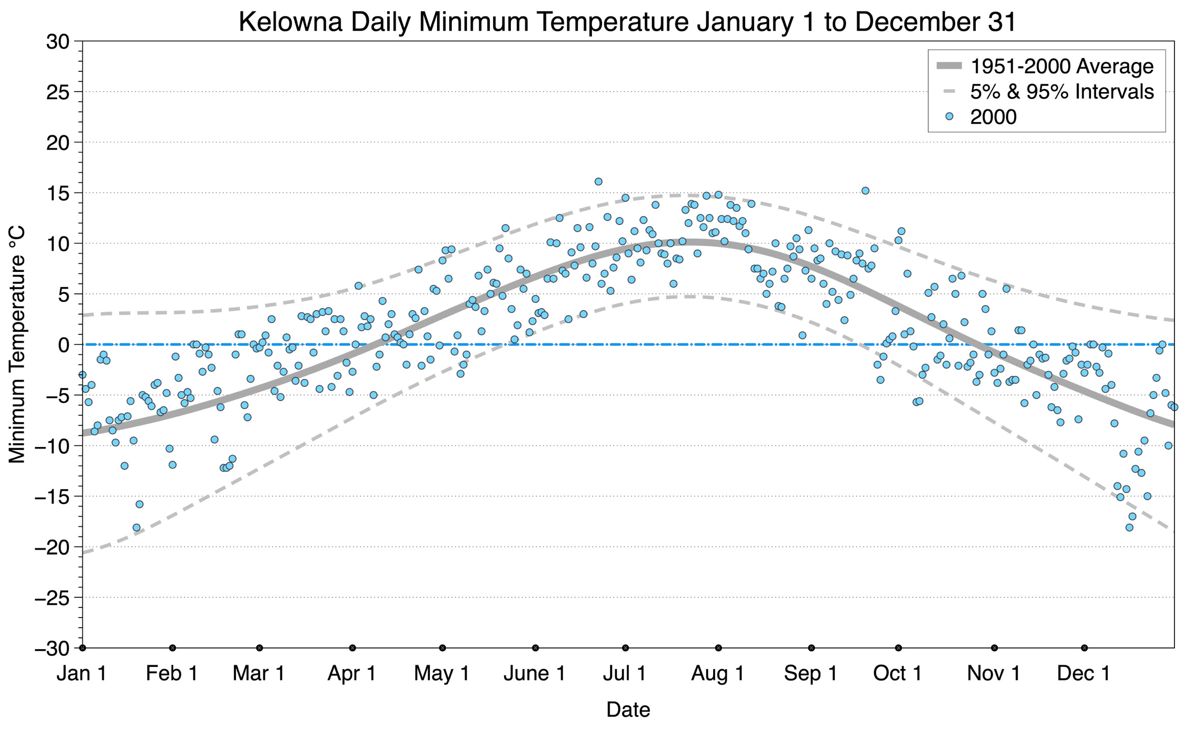 The graph below displays the day-to-day values of minimum daily temperature (blue dots) at Kelowna for the year 2000. On this graph, the dark grey thick center line is the average daily temperature calculated from 50 years of data from 1951 to 2000. The dotted light grey lines are the 5% and 95% probability intervals - about 90% of the data from 1951 to 2000 fell within these boundaries. Daily temperatures can be considered as extreme cold or extreme hot events if they that fall outside the 5% or 95% probability intervals, respectively.