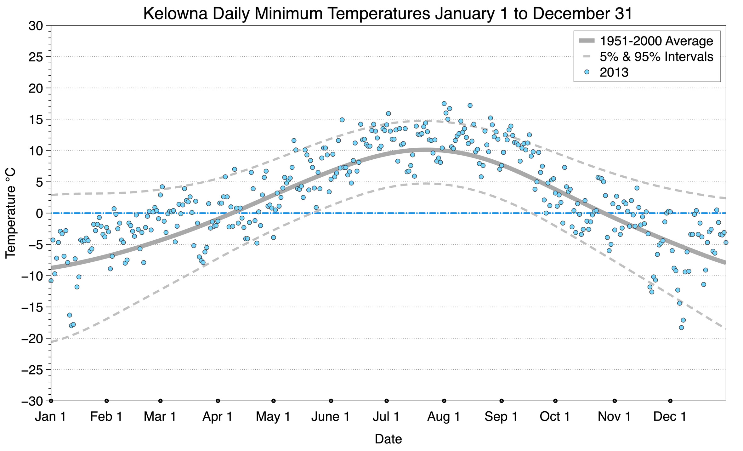 The graph below displays the day-to-day values of minimum daily temperature (blue dots) at Kelowna for the year 2013. On this graph, the dark grey thick center line is the average daily temperature calculated from 50 years of data from 1951 to 2000. The dotted light grey lines are the 5% and 95% probability intervals - about 90% of the data from 1951 to 2000 fell within these boundaries. Daily temperatures can be considered as extreme cold or extreme hot events if they that fall outside the 5% or 95% probability intervals, respectively.