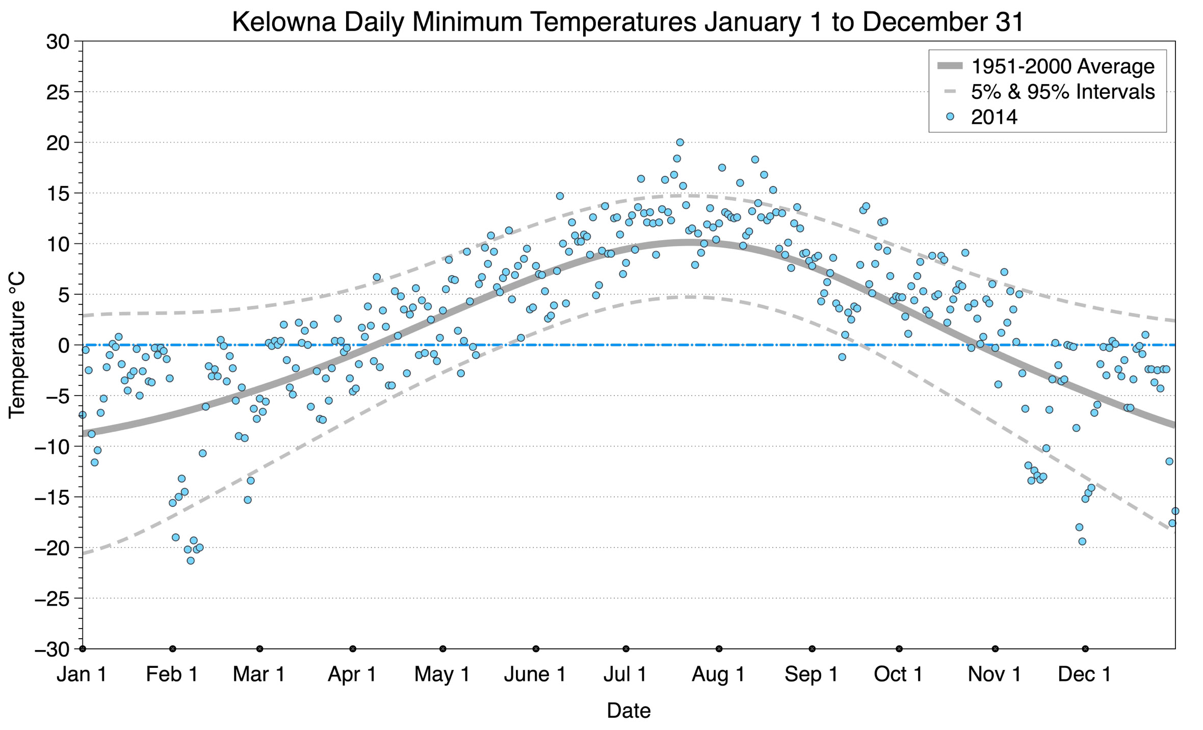 The graph below displays the day-to-day values of minimum daily temperature (blue dots) at Kelowna for the year 2014. On this graph, the dark grey thick center line is the average daily temperature calculated from 50 years of data from 1951 to 2000. The dotted light grey lines are the 5% and 95% probability intervals - about 90% of the data from 1951 to 2000 fell within these boundaries. Daily temperatures can be considered as extreme cold or extreme hot events if they that fall outside the 5% or 95% probability intervals, respectively.
