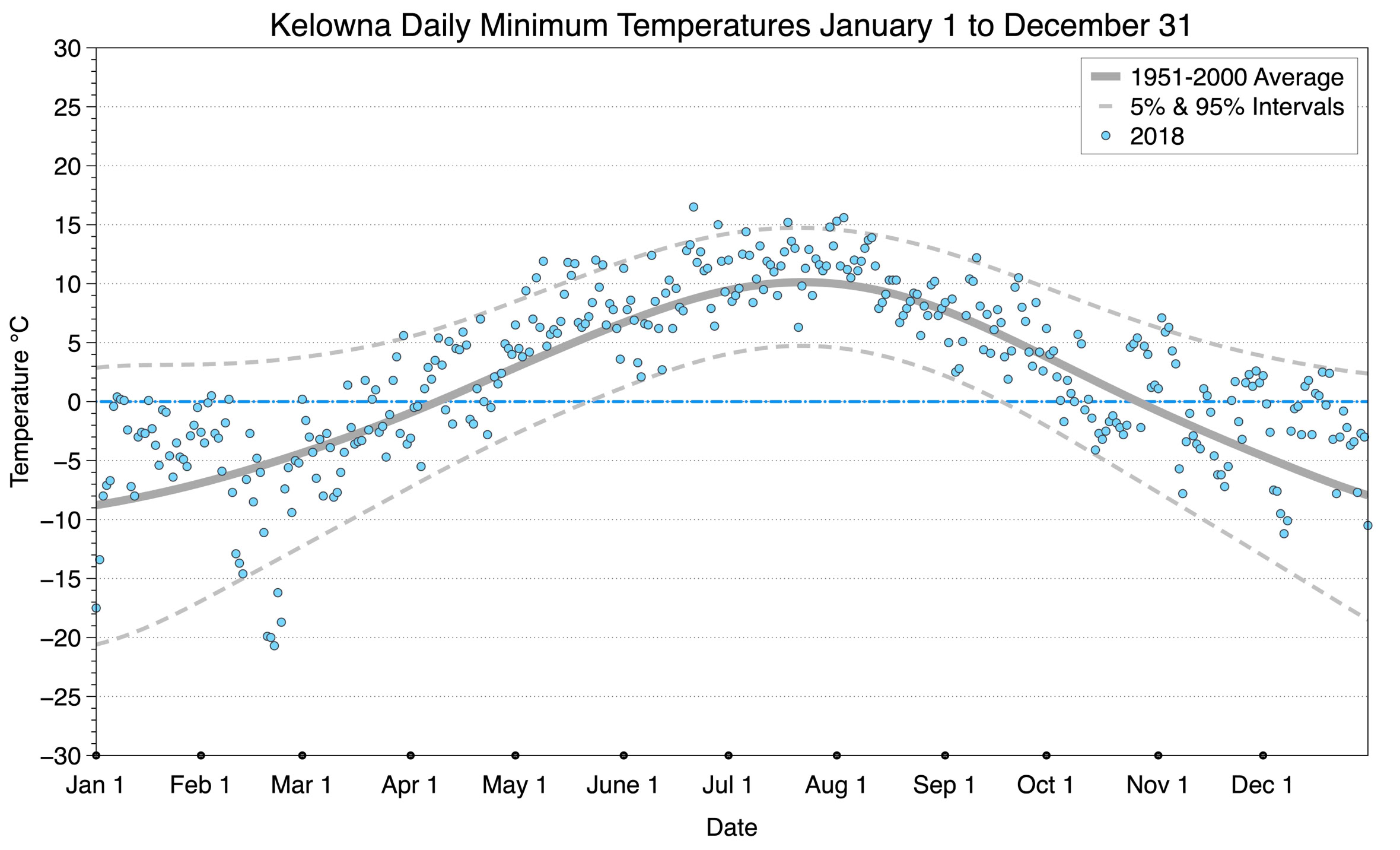 The graph below displays the day-to-day values of minimum daily temperature (blue dots) at Kelowna for the year 2018. On this graph, the dark grey thick center line is the average daily temperature calculated from 50 years of data from 1951 to 2000. The dotted light grey lines are the 5% and 95% probability intervals - about 90% of the data from 1951 to 2000 fell within these boundaries. Daily temperatures can be considered as extreme cold or extreme hot events if they that fall outside the 5% or 95% probability intervals, respectively.