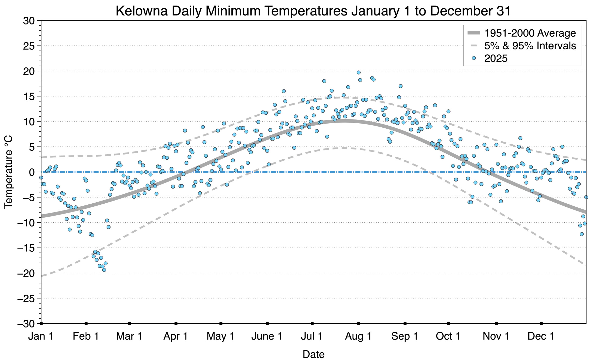 The graph below displays the day-to-day values of minimum daily temperature (blue dots) at Kelowna for the year 2026. On this graph, the dark grey thick center line is the average daily temperature calculated from 50 years of data from 1951 to 2000. The dotted light grey lines are the 5% and 95% probability intervals - about 90% of the data from 1951 to 2000 fell within these boundaries. Daily temperatures can be considered as extreme cold or extreme hot events if they that fall outside the 5% or 95% probability intervals, respectively.