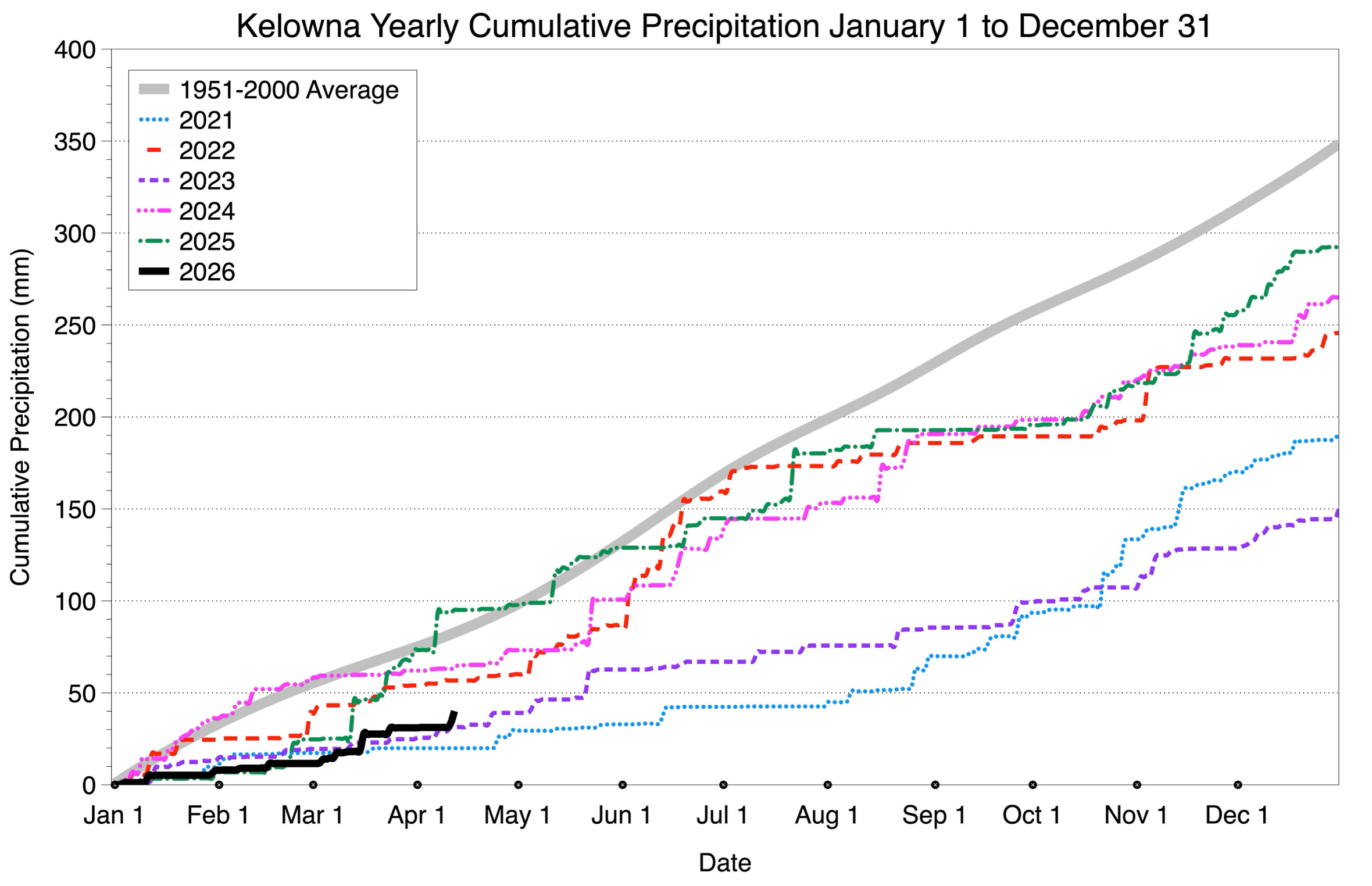 The graph below shows Kelowna’s cumulative precipitation from January 1 to December 31. Six years are displayed - 2026, 2025, 2024, 2023, 2022, and 2021. The grey thick line is the average cumulative precipitation calculated from 50 years of data from 1951 to 2000. Average total cumulative precipitation for 1951 to 2000 by December 31 is 349 mm. An extreme Summer (June 1 to August 31) drought occurred in 2021 and 2023 when cumulative precipitation was less than 50% of normal. 2023 is considered the most destructive wildfire season ever recorded in British Columbia. During 2023, very little rallfall occurred between the middle of May to late September. As shown, 2026 is off to a bad start with cumulative precipitation about 49% of the 1951 to 2000 average.