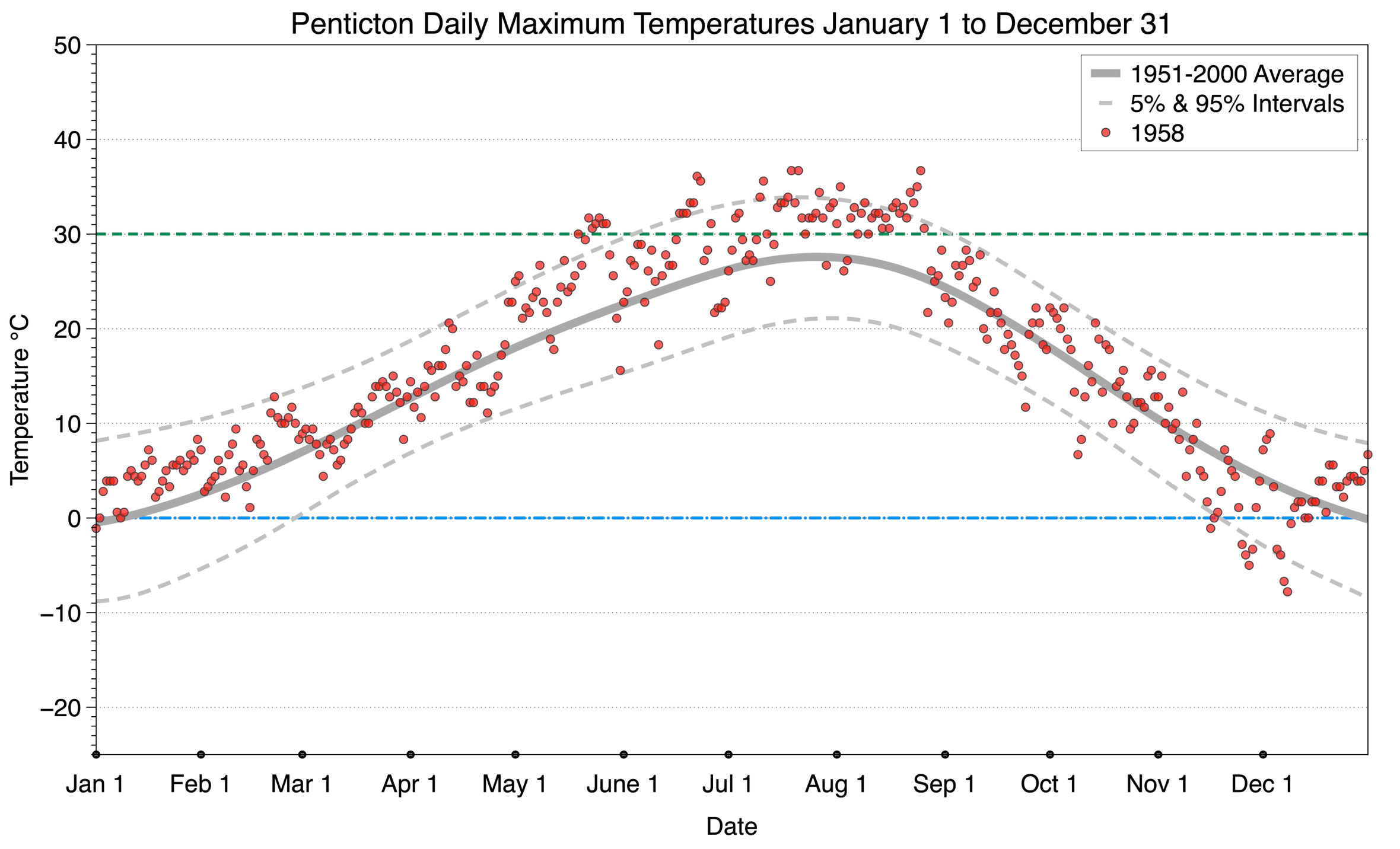 The graph below displays the day-to-day values of maximum daily temperature (red dots) at Penticton for the year 1958. On this graph, the dark grey thick center line is the average daily temperature calculated from 50 years of data from 1951 to 2000. The dotted light grey lines are the 5% and 95% probability intervals - about 90% of the data from 1951 to 2000 fell within these boundaries. Daily temperatures can be considered as extreme cold or extreme hot events if they that fall outside the 5% or 95% probability intervals, respectively. In Canada, temperatures above 30°C (green dashed line) are considered extreme daily temperatures.