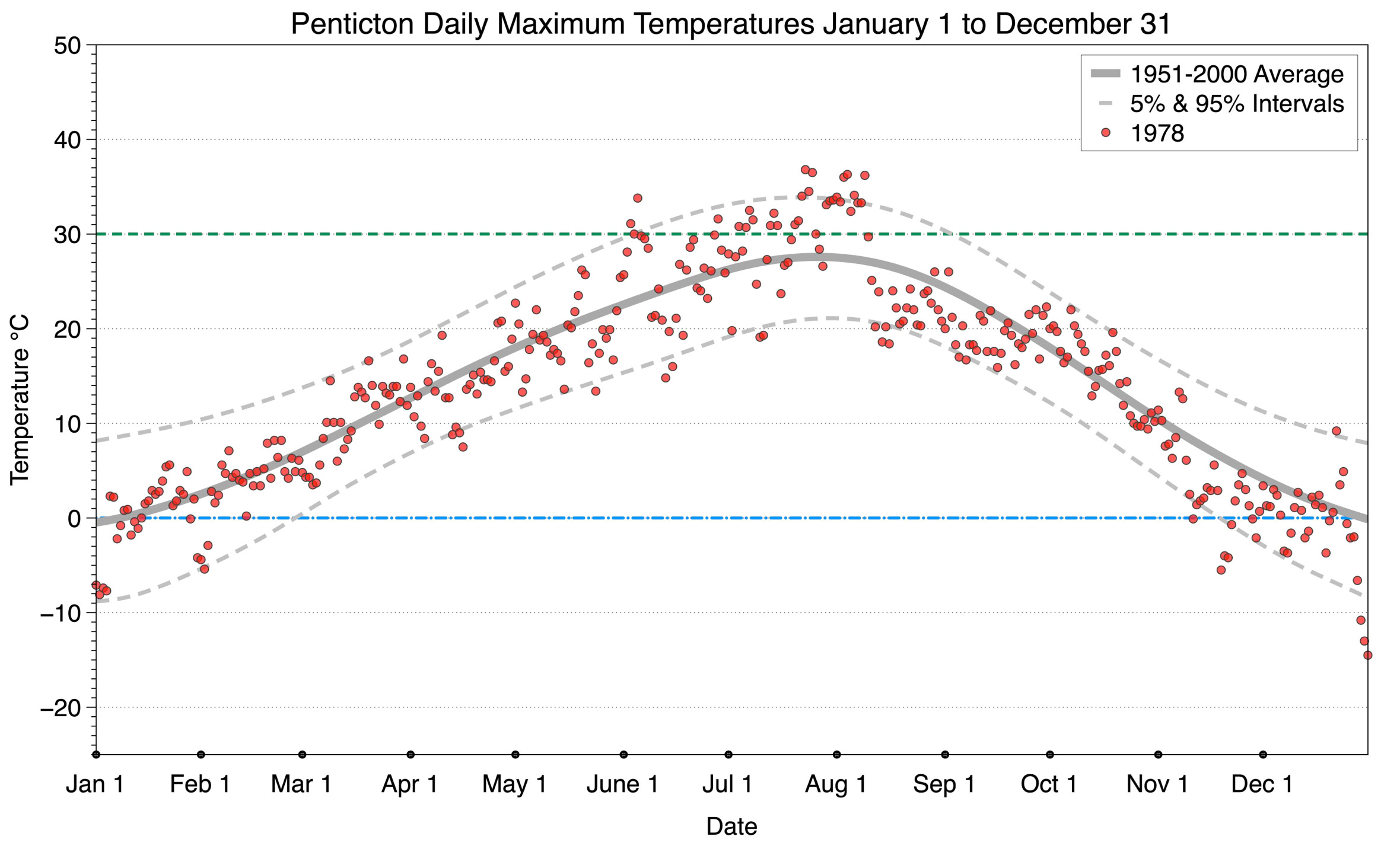 The graph below displays the day-to-day values of maximum daily temperature (red dots) at Penticton for the year 1978. On this graph, the dark grey thick center line is the average daily temperature calculated from 50 years of data from 1951 to 2000. The dotted light grey lines are the 5% and 95% probability intervals - about 90% of the data from 1951 to 2000 fell within these boundaries. Daily temperatures can be considered as extreme cold or extreme hot events if they that fall outside the 5% or 95% probability intervals, respectively. In Canada, temperatures above 30°C (green dashed line) are considered extreme daily temperatures.