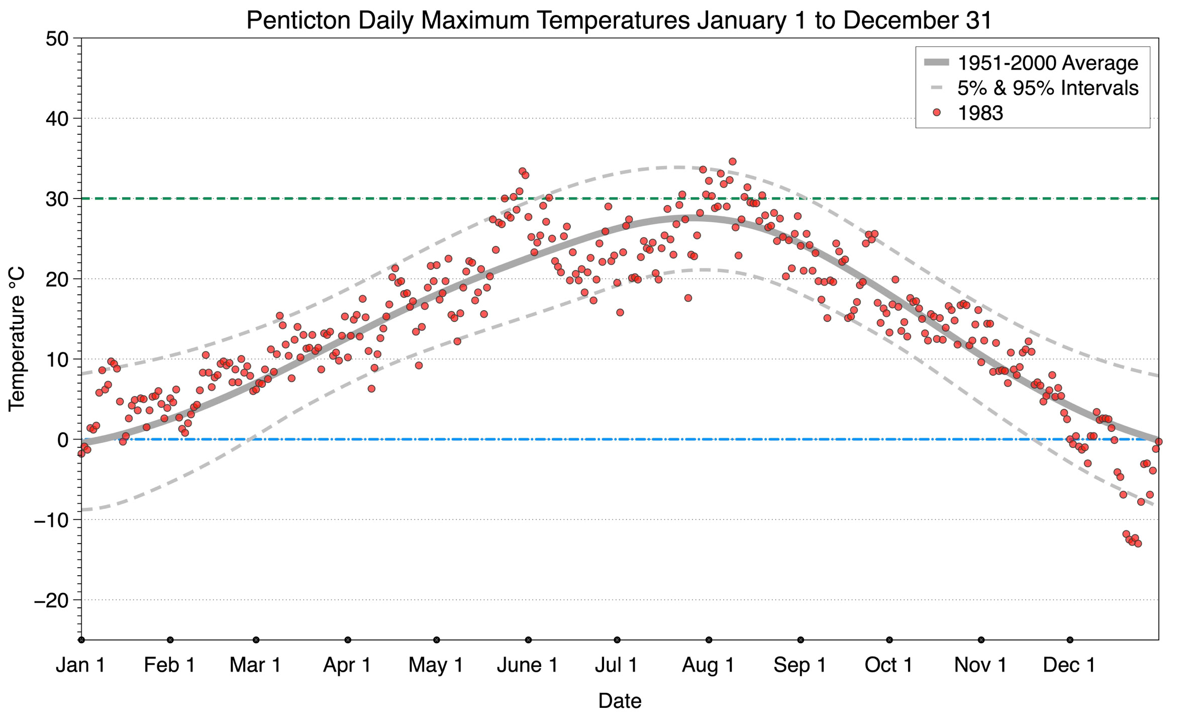 The graph below displays the day-to-day values of maximum daily temperature (red dots) at Penticton for the year 1983. On this graph, the dark grey thick center line is the average daily temperature calculated from 50 years of data from 1951 to 2000. The dotted light grey lines are the 5% and 95% probability intervals - about 90% of the data from 1951 to 2000 fell within these boundaries. Daily temperatures can be considered as extreme cold or extreme hot events if they that fall outside the 5% or 95% probability intervals, respectively. In Canada, temperatures above 30°C (green dashed line) are considered extreme daily temperatures.