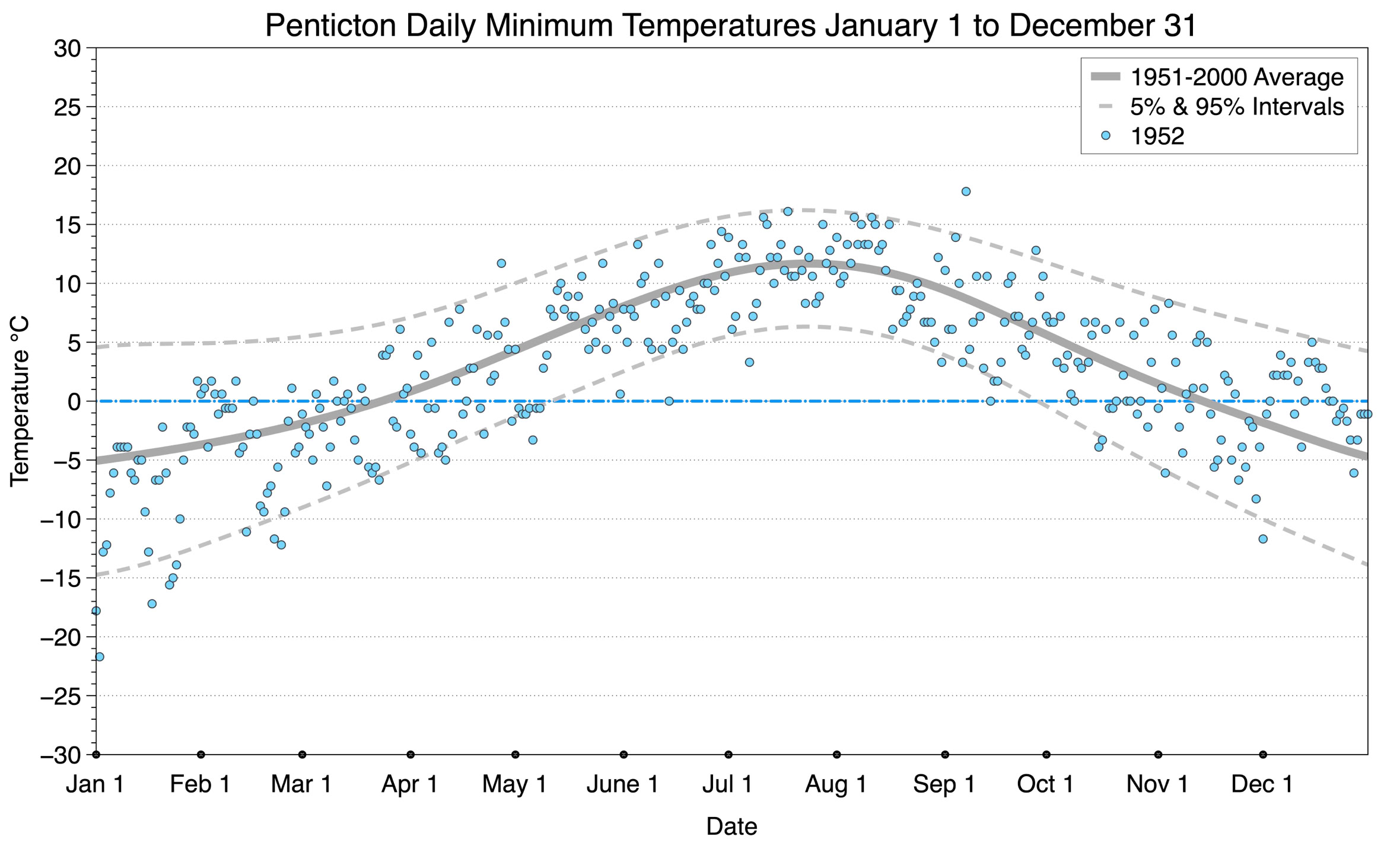 The graph below displays the day-to-day values of minimum daily temperature (blue dots) at Penticton for the year 1952. On this graph, the dark grey thick center line is the average daily temperature calculated from 50 years of data from 1951 to 2000. The dotted light grey lines are the 5% and 95% probability intervals - about 90% of the data from 1951 to 2000 fell within these boundaries. Daily temperatures can be considered as extreme cold or extreme hot events if they that fall outside the 5% or 95% probability intervals, respectively.