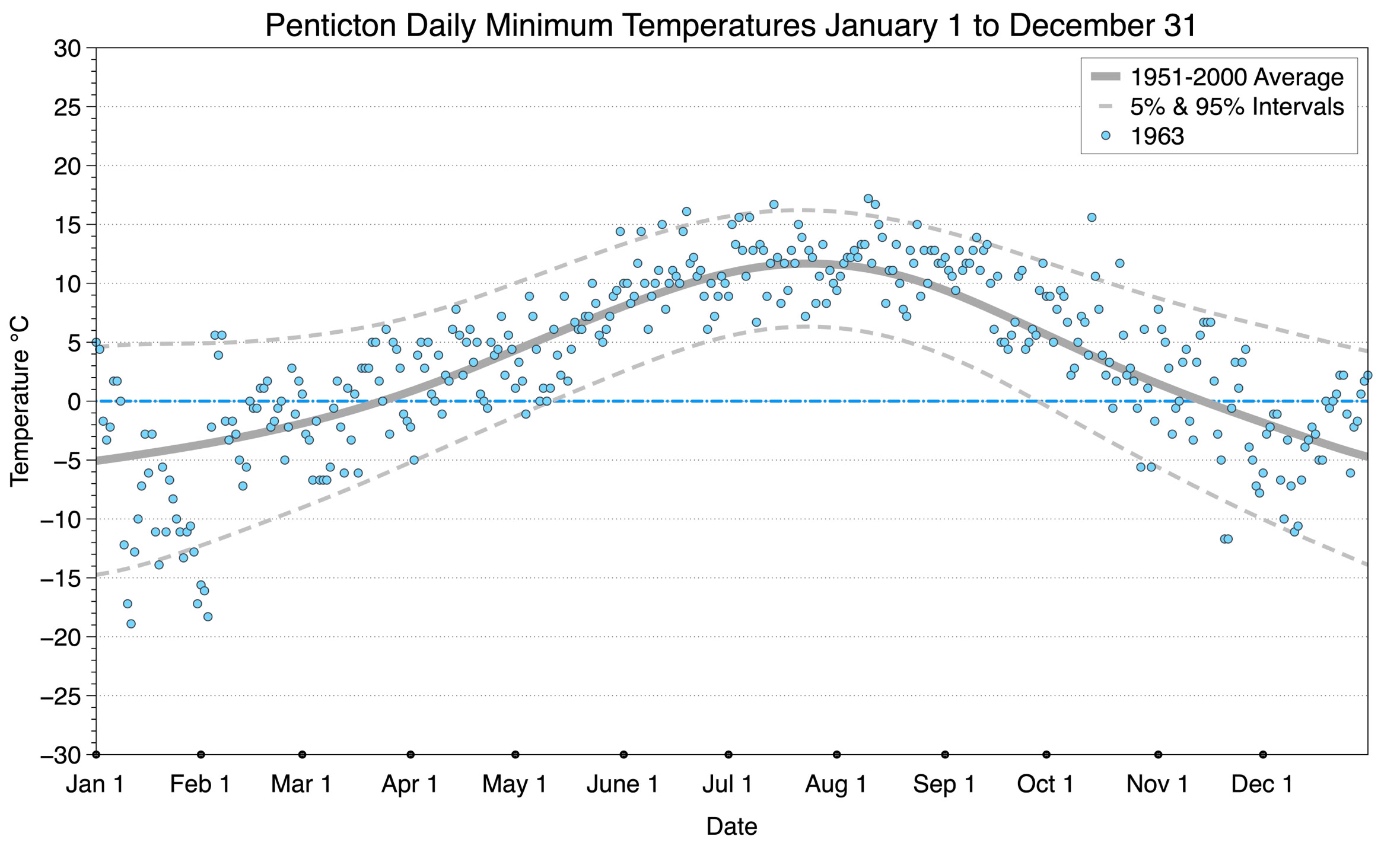 The graph below displays the day-to-day values of minimum daily temperature (blue dots) at Penticton for the year 1963. On this graph, the dark grey thick center line is the average daily temperature calculated from 50 years of data from 1951 to 2000. The dotted light grey lines are the 5% and 95% probability intervals - about 90% of the data from 1951 to 2000 fell within these boundaries. Daily temperatures can be considered as extreme cold or extreme hot events if they that fall outside the 5% or 95% probability intervals, respectively.