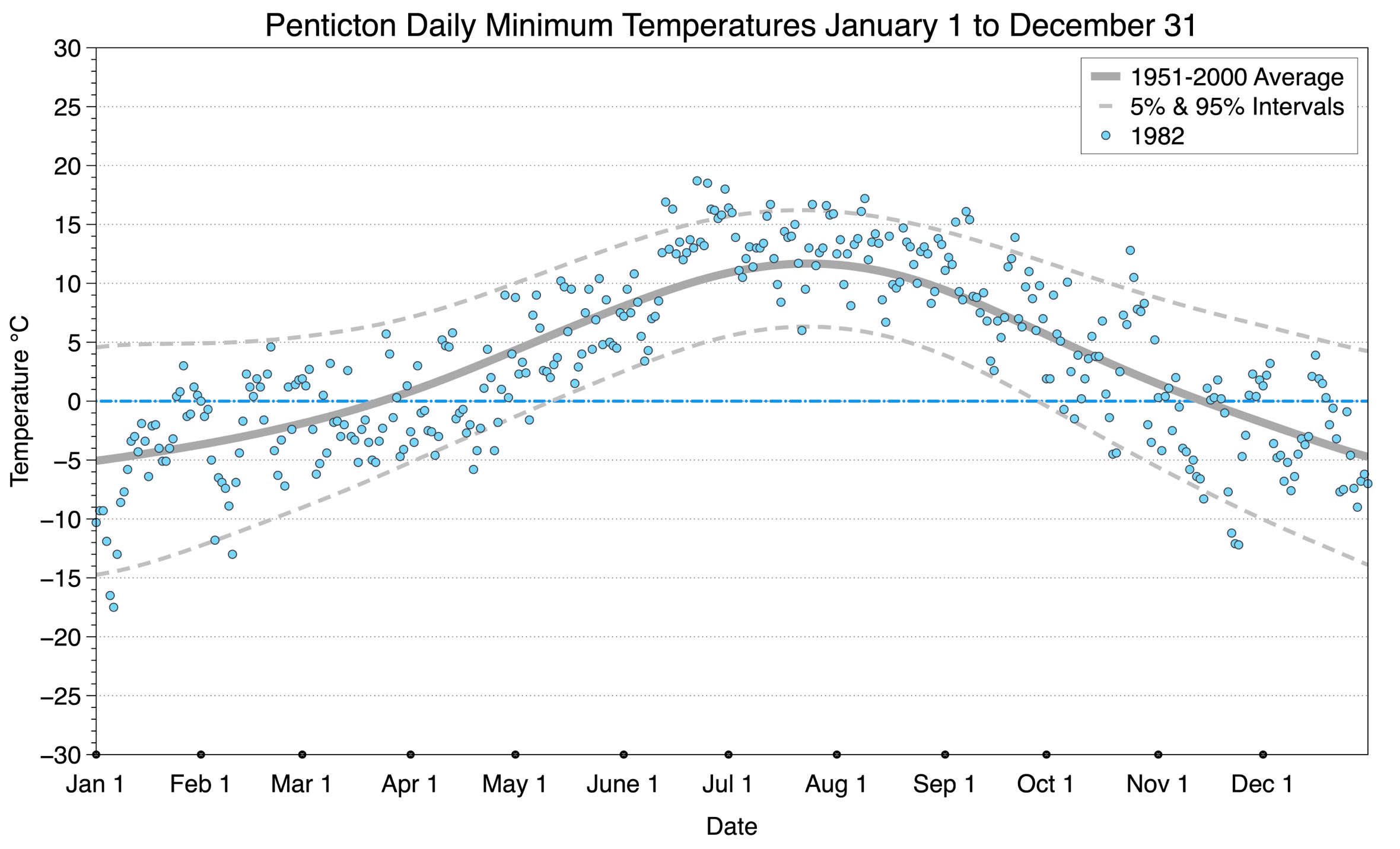 The graph below displays the day-to-day values of minimum daily temperature (blue dots) at Penticton for the year 1982. On this graph, the dark grey thick center line is the average daily temperature calculated from 50 years of data from 1951 to 2000. The dotted light grey lines are the 5% and 95% probability intervals - about 90% of the data from 1951 to 2000 fell within these boundaries. Daily temperatures can be considered as extreme cold or extreme hot events if they that fall outside the 5% or 95% probability intervals, respectively.