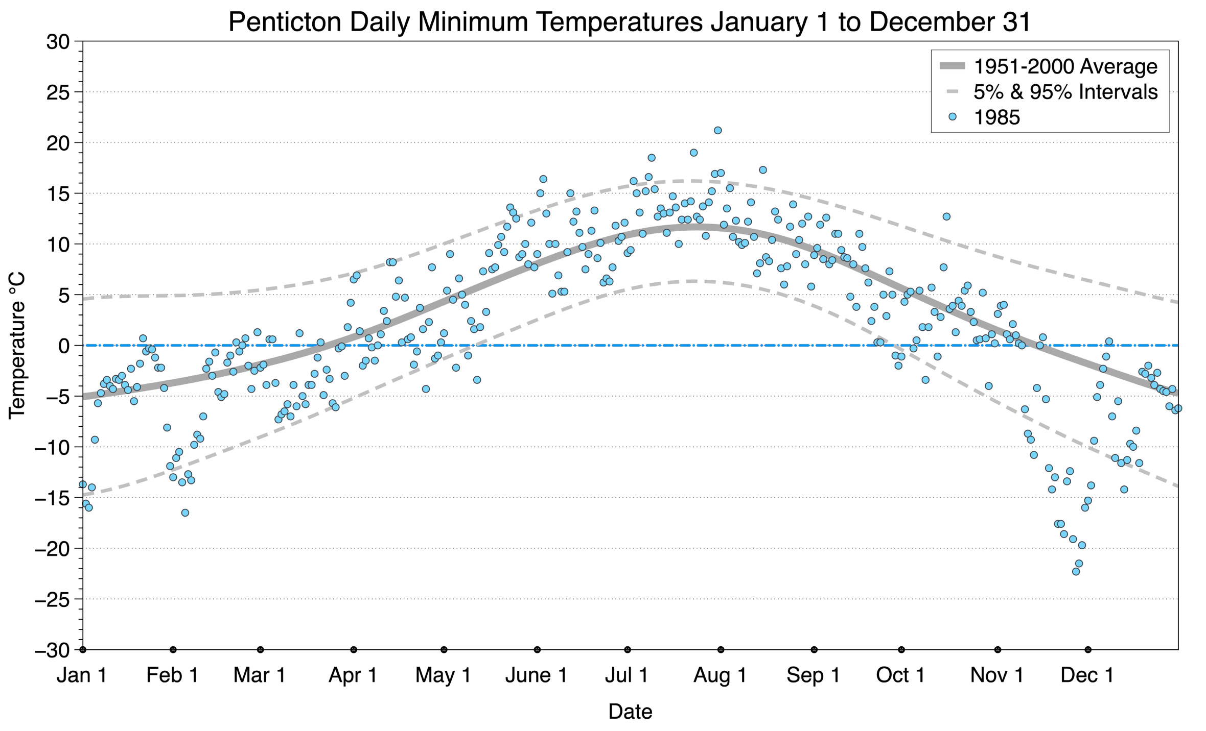 The graph below displays the day-to-day values of minimum daily temperature (blue dots) at Penticton for the year 1985. On this graph, the dark grey thick center line is the average daily temperature calculated from 50 years of data from 1951 to 2000. The dotted light grey lines are the 5% and 95% probability intervals - about 90% of the data from 1951 to 2000 fell within these boundaries. Daily temperatures can be considered as extreme cold or extreme hot events if they that fall outside the 5% or 95% probability intervals, respectively.