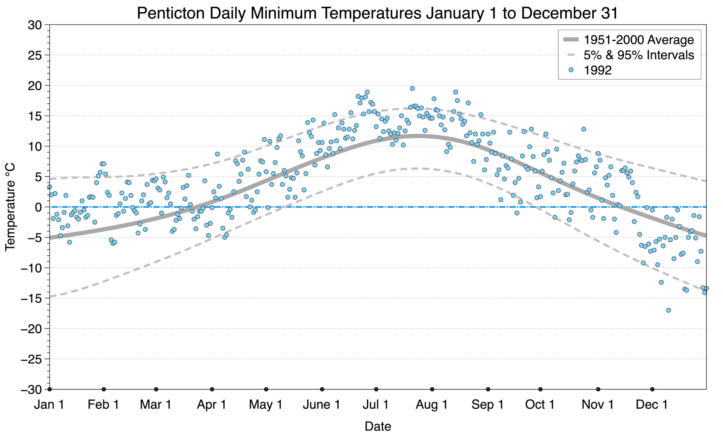 The graph below displays the day-to-day values of minimum daily temperature (blue dots) at Penticton for the year 1992. On this graph, the dark grey thick center line is the average daily temperature calculated from 50 years of data from 1951 to 2000. The dotted light grey lines are the 5% and 95% probability intervals - about 90% of the data from 1951 to 2000 fell within these boundaries. Daily temperatures can be considered as extreme cold or extreme hot events if they that fall outside the 5% or 95% probability intervals, respectively.