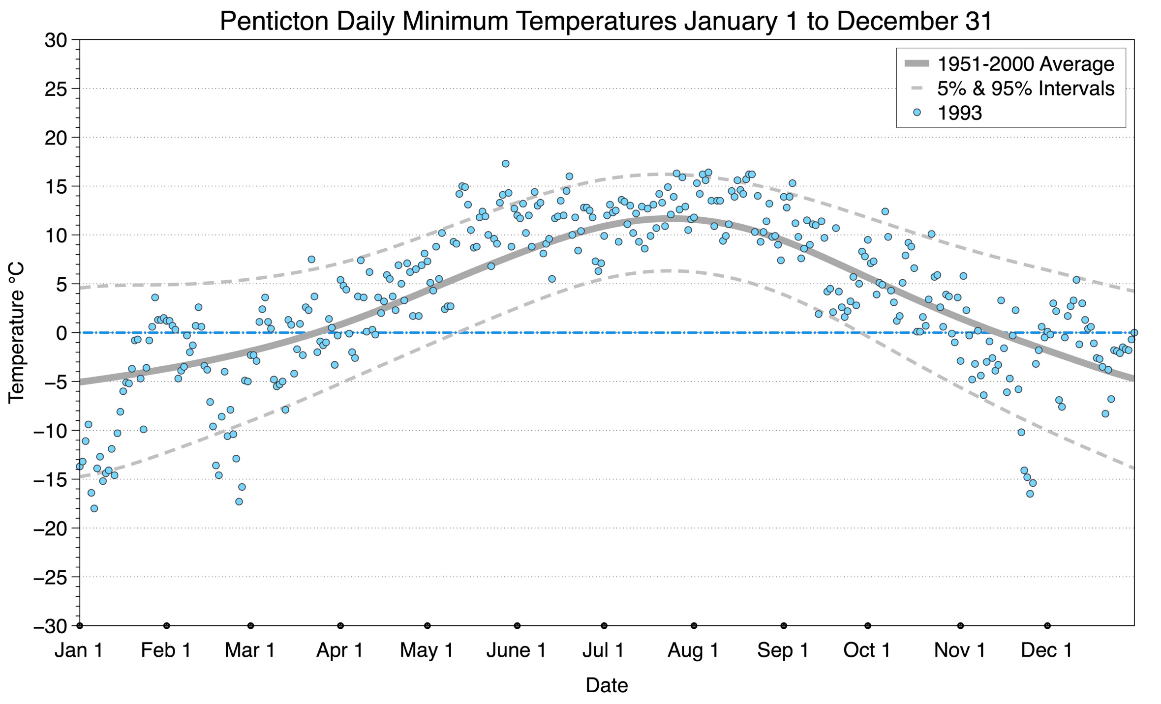 The graph below displays the day-to-day values of minimum daily temperature (blue dots) at Penticton for the year 1993. On this graph, the dark grey thick center line is the average daily temperature calculated from 50 years of data from 1951 to 2000. The dotted light grey lines are the 5% and 95% probability intervals - about 90% of the data from 1951 to 2000 fell within these boundaries. Daily temperatures can be considered as extreme cold or extreme hot events if they that fall outside the 5% or 95% probability intervals, respectively.