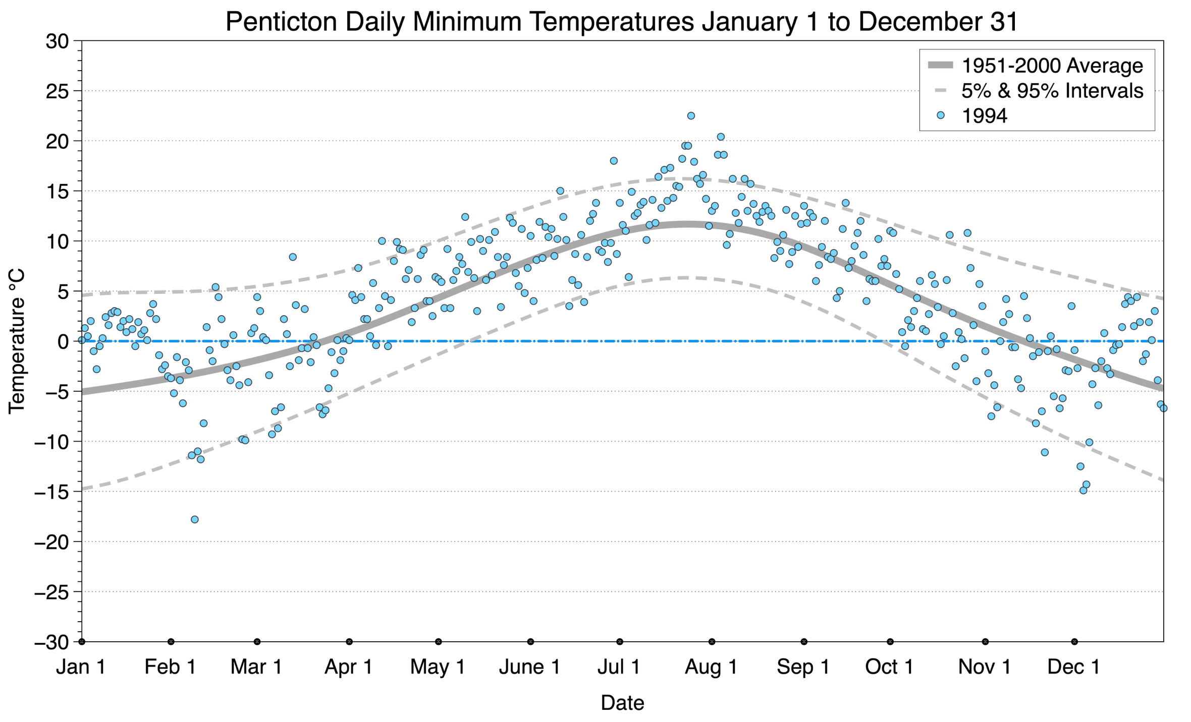 The graph below displays the day-to-day values of minimum daily temperature (blue dots) at Penticton for the year 1994. On this graph, the dark grey thick center line is the average daily temperature calculated from 50 years of data from 1951 to 2000. The dotted light grey lines are the 5% and 95% probability intervals - about 90% of the data from 1951 to 2000 fell within these boundaries. Daily temperatures can be considered as extreme cold or extreme hot events if they that fall outside the 5% or 95% probability intervals, respectively.