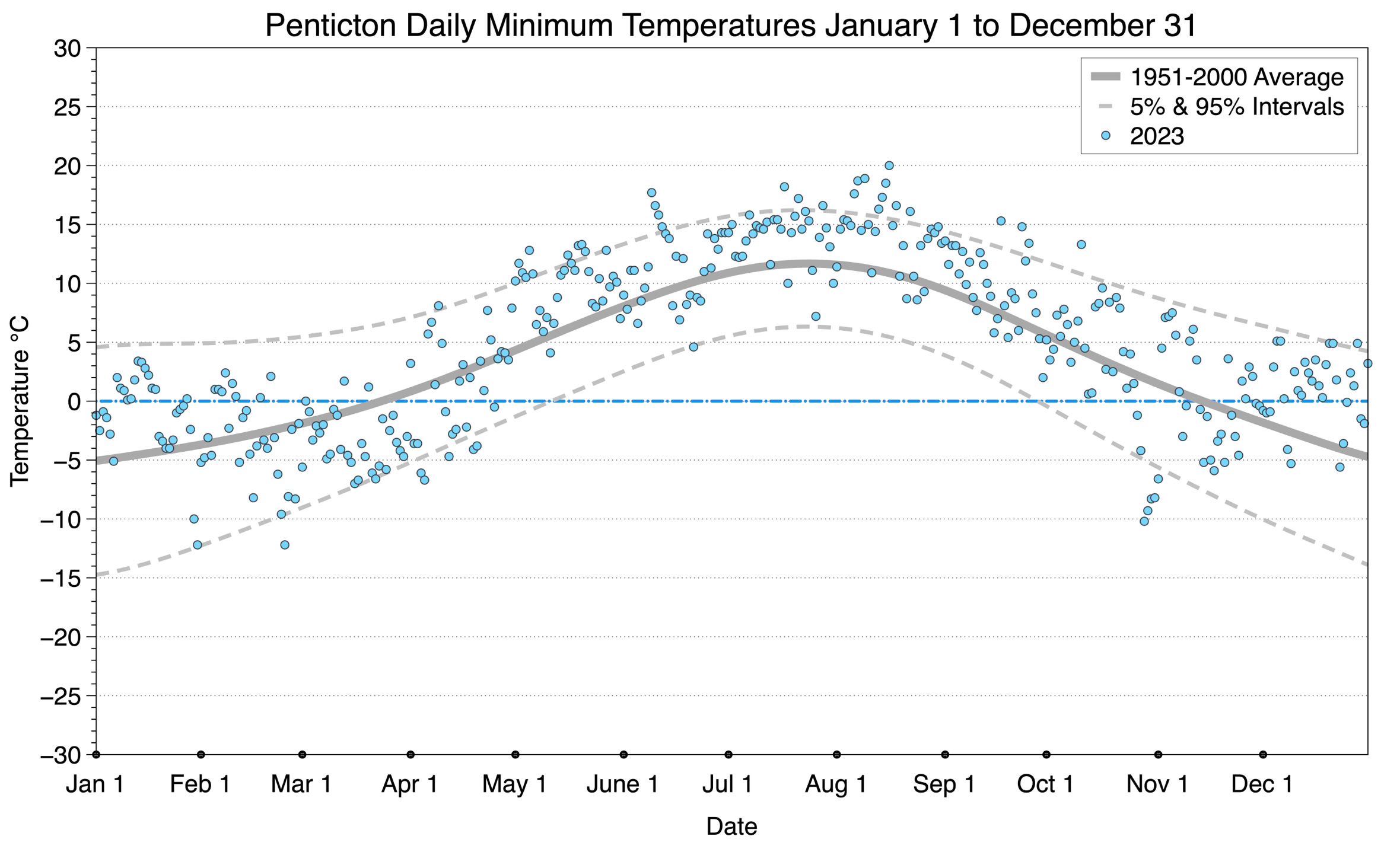 The graph below displays the day-to-day values of minimum daily temperature (blue dots) at Penticton for the year 2023. On this graph, the dark grey thick center line is the average daily temperature calculated from 50 years of data from 1951 to 2000. The dotted light grey lines are the 5% and 95% probability intervals - about 90% of the data from 1951 to 2000 fell within these boundaries. Daily temperatures can be considered as extreme cold or extreme hot events if they that fall outside the 5% or 95% probability intervals, respectively.