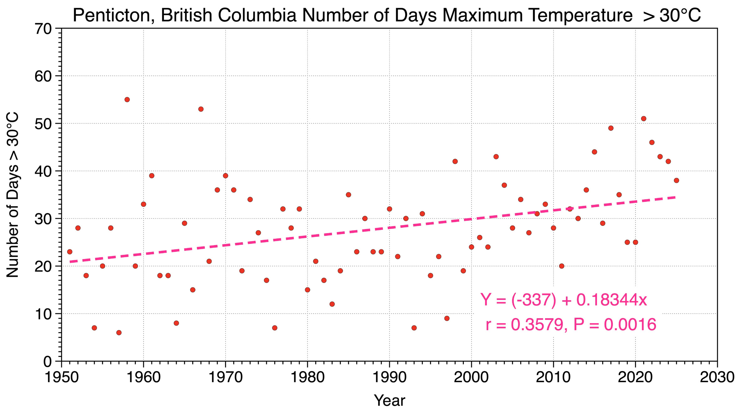 Figure 11 Yearly number of maximum daily temperature events > 30°C from 1951 to 2025 in Penticton. Maximum daily temperature events > 30°C have been steadily increasing at a rate of about 1.8 days per decade according to linear regression analysis.