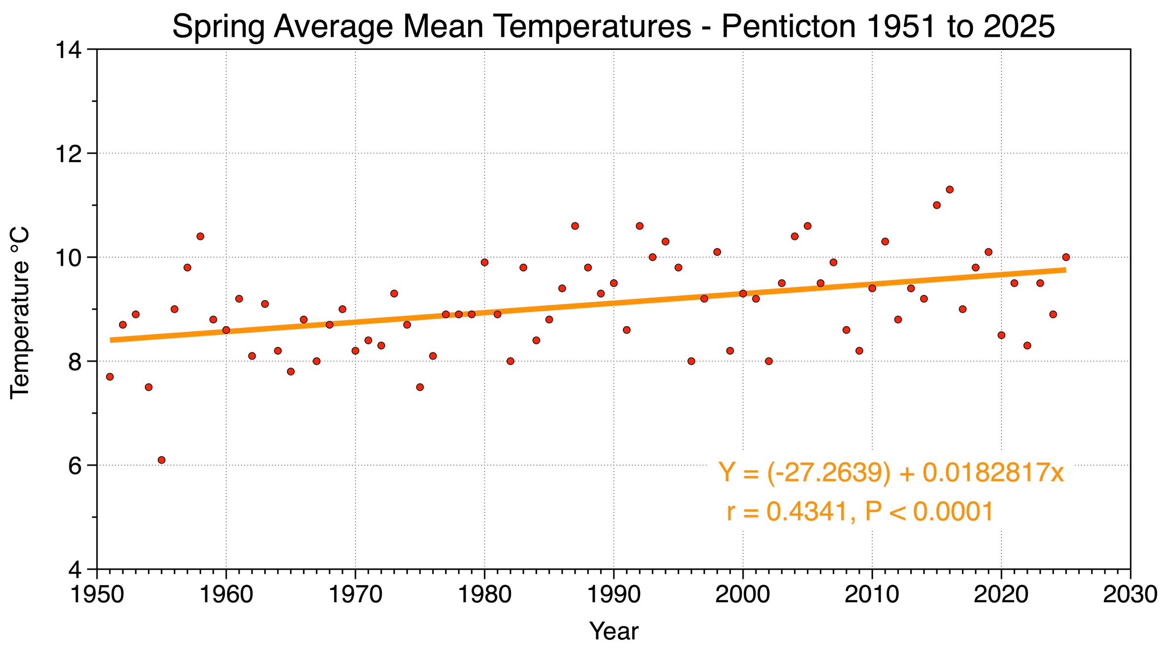 Figure 5 Penticton’s spring average mean temperatures from 1951 to 2025. Spring average mean temperature has been steadily increasing at a rate of 0.18°C per decade according to linear regression analysis.