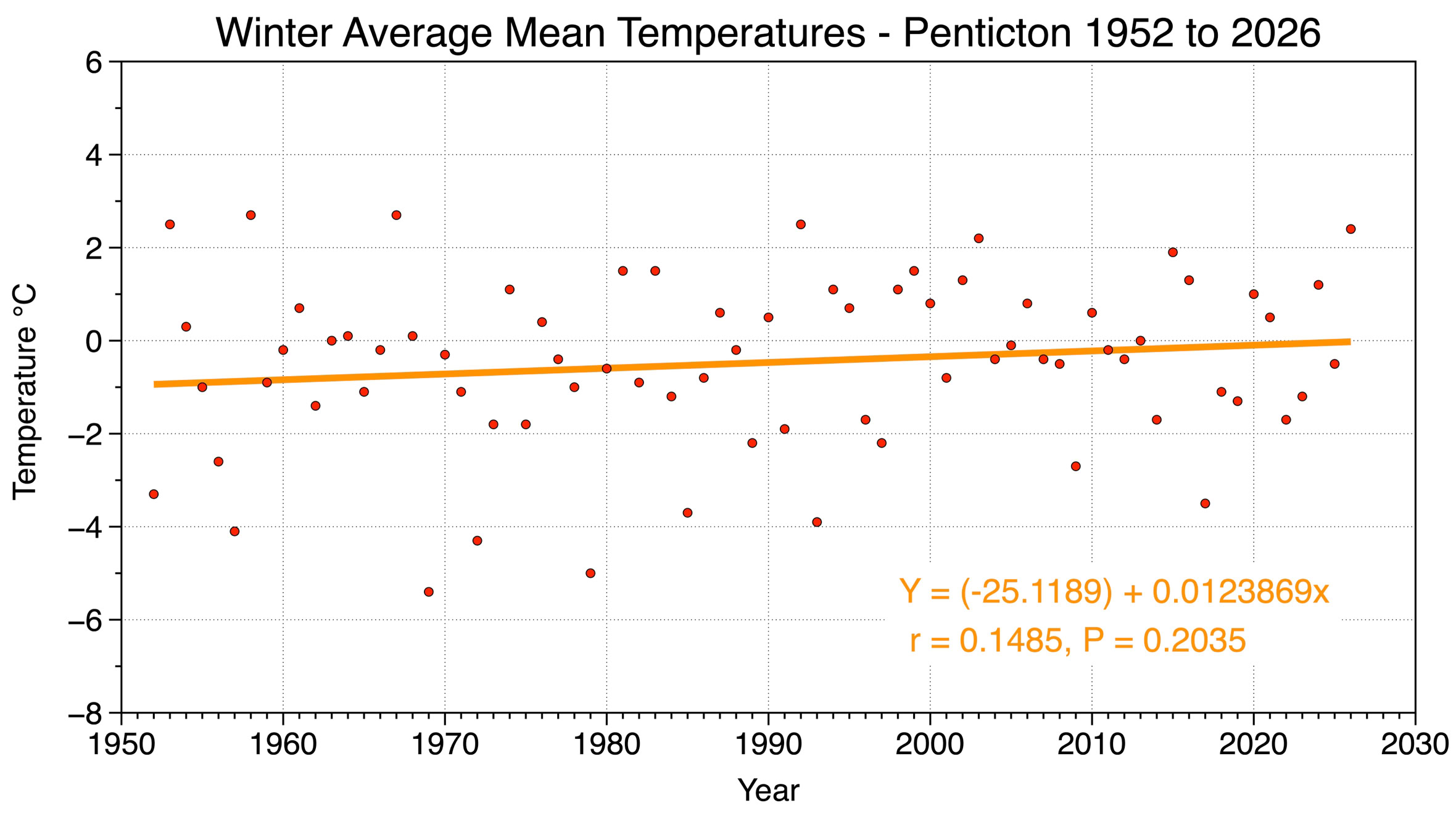 Figure 8 Penticton’s winter average mean temperatures from 1952 to 2026. Winter average mean temperature has been increasing at a rate of 0.12°C per decade according to linear regression analysis. This increase was not found to be statistically significant.