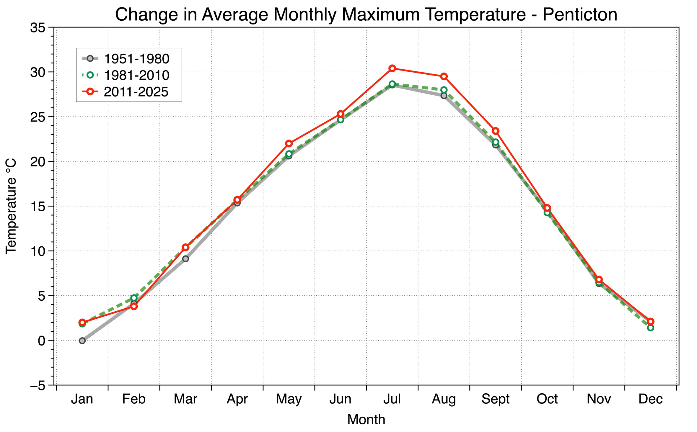 Figure 10 The historical change in average monthly maximum temperatures for three periods: 1951 to 1980, 1981 to 2010, and 2011 to 2025.