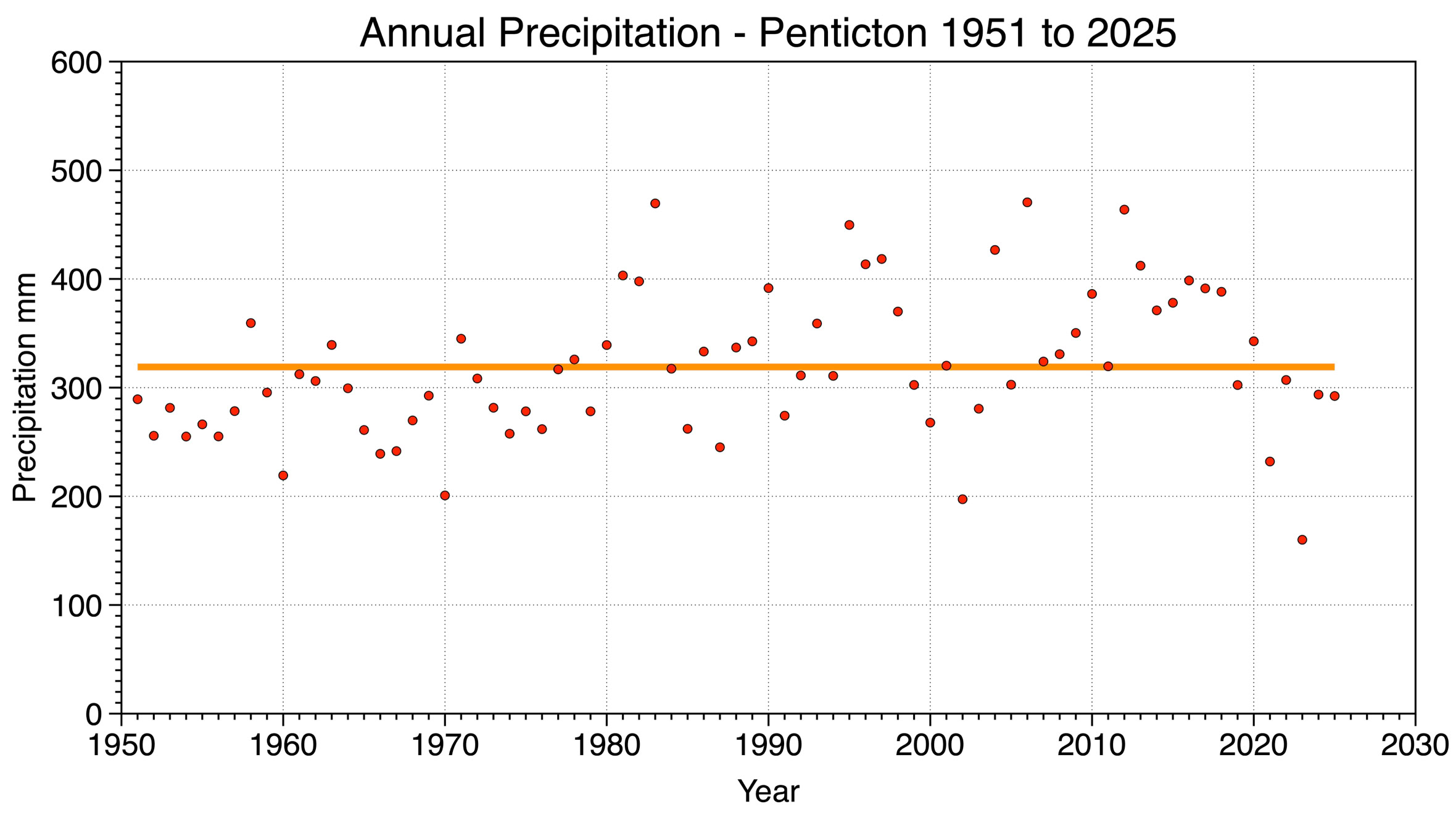Figure 4 Penticton’s annual precipitation from 1951 to 2025. The orange line shows the average value for this period which was 319 mm.