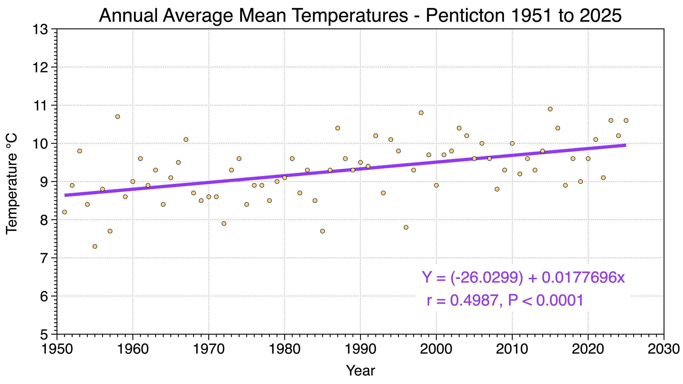 Figure 2 Penticton’s annual average mean temperatures from 1951 to 2025. Annual average mean temperature has been steadily increasing at a rate of 0.18°C per decade according to linear regression analysis.