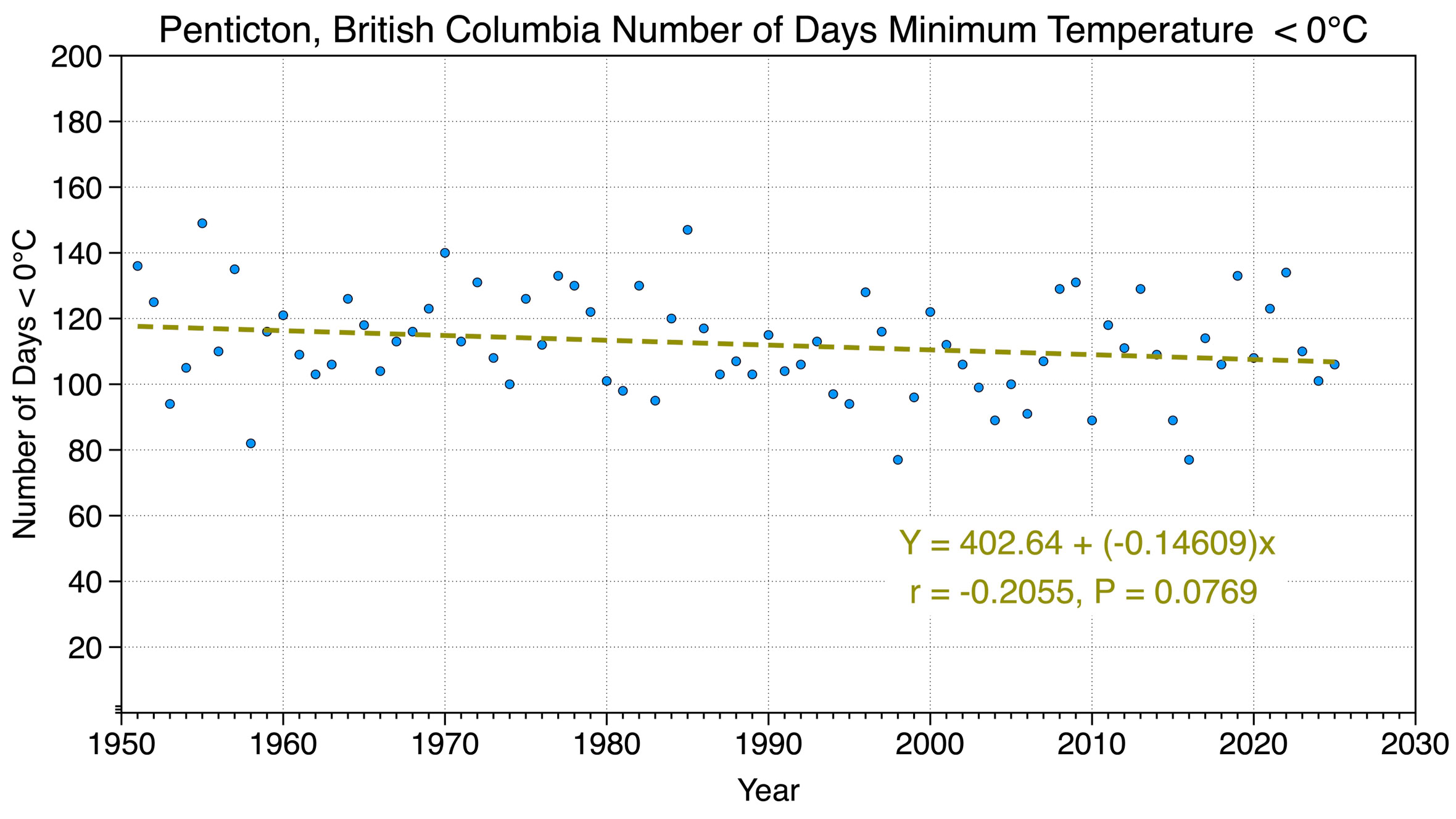 Figure 12 Yearly number of minumum daily temperature events < 0°C from 1951 to 2025 in Penticton. Minimum daily temperature events < 0°C have been steadily decreasing at a rate of about 1.5 days per decade according to linear regression analysis.