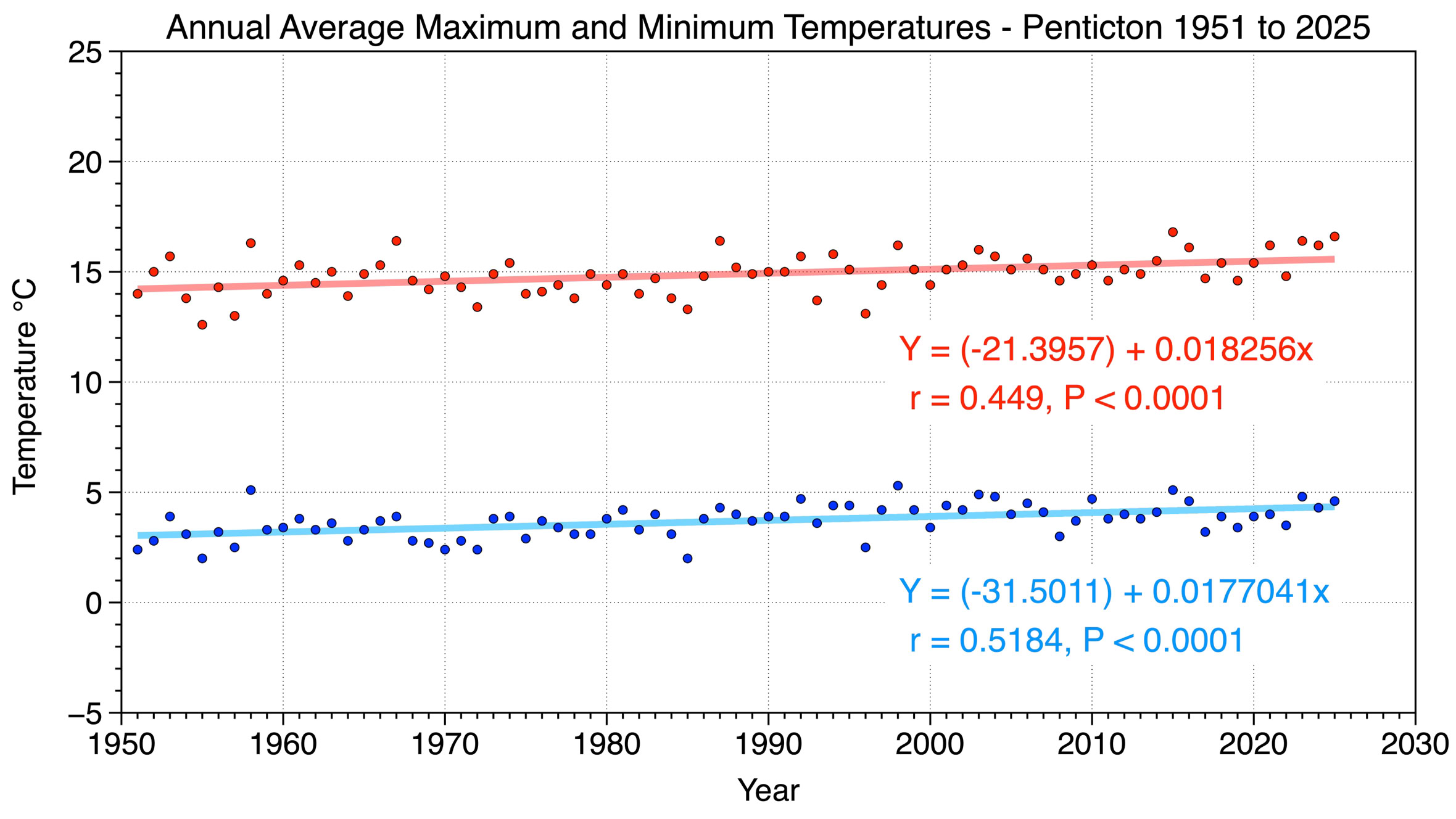 Figure 3 Penticton’s annual average maximum and minimum temperatures from 1951 to 2025. Annual average maximum temperature has been steadily increasing at a rate of 0.18°C per decade, while annual average minimum temperature has been steadily increasing at a rate of 0.18°C per decade according to linear regression analysis.