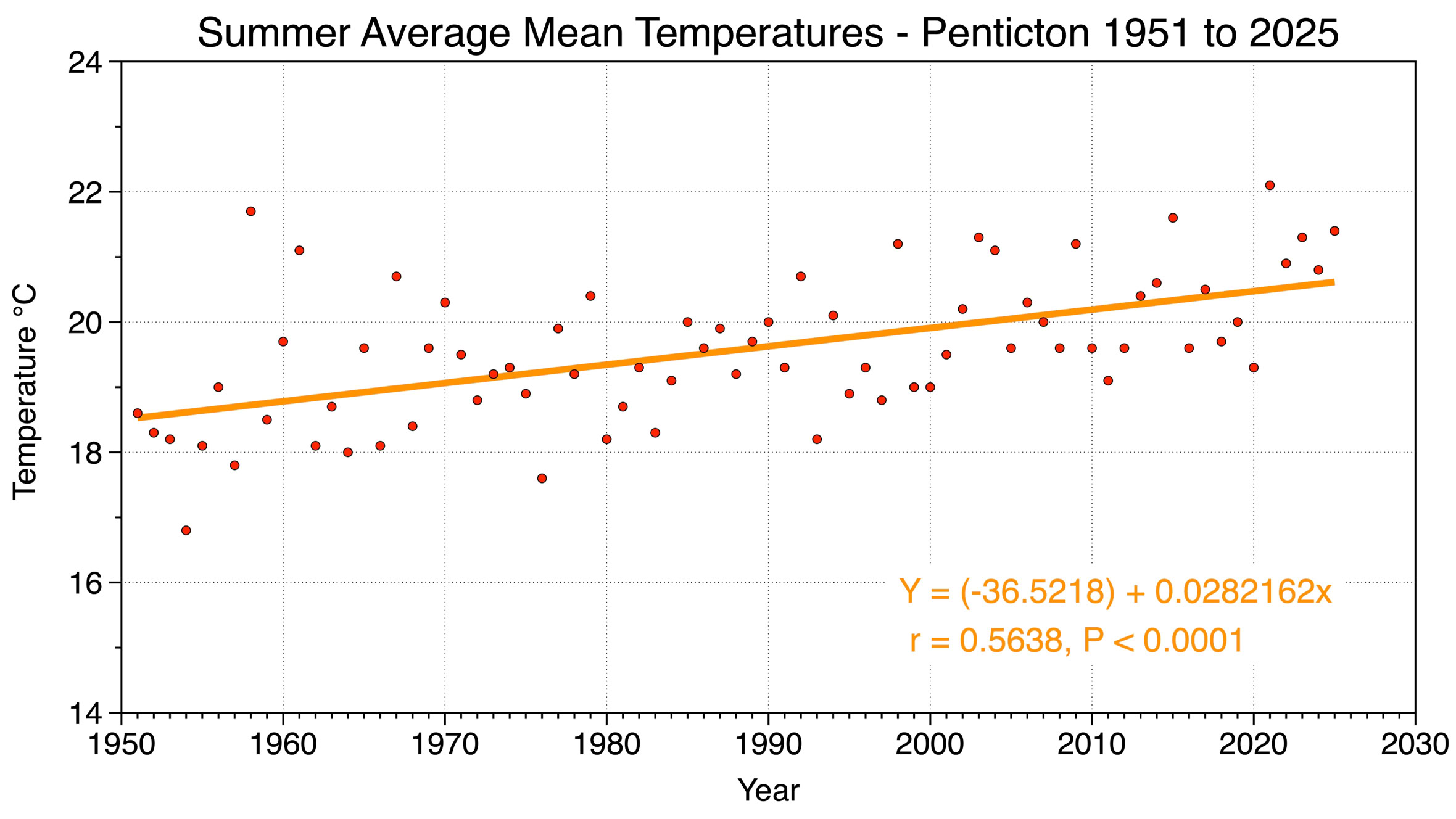 Figure 6 Penticton’s summer average mean temperatures from 1951 to 2025. Summer average mean temperature has been steadily increasing at a rate of 0.28°C per decade according to linear regression analysis.
