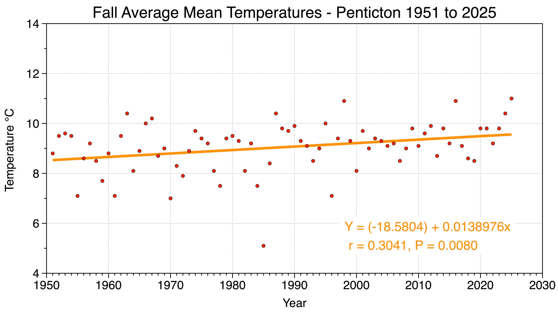 Figure 7 Penticton’s fall average mean temperatures from 1951 to 2025. Fall average mean temperature has been steadily increasing at a rate of 0.14°C per decade according to linear regression analysis.