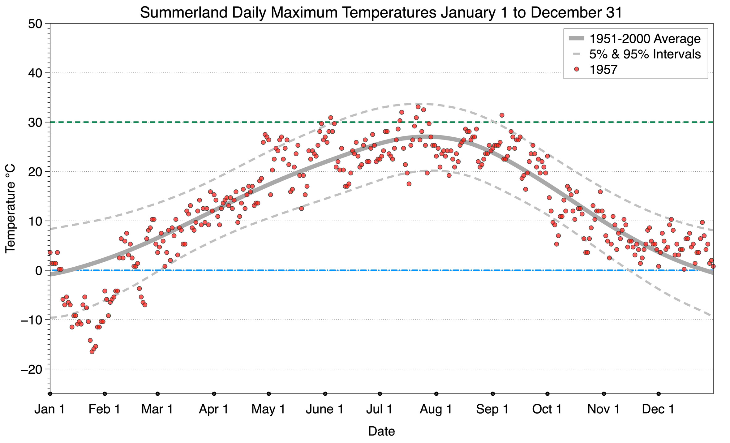 The graph below displays the day-to-day values of maximum daily temperature (red dots) at Summerland for the year 1957. On this graph, the dark grey thick center line is the average daily temperature calculated from 50 years of data from 1951 to 2000. The dotted light grey lines are the 5% and 95% probability intervals - about 90% of the data from 1951 to 2000 fell within these boundaries. Daily temperatures can be considered as extreme cold or extreme hot events if they that fall outside the 5% or 95% probability intervals, respectively. In Canada, temperatures above 30°C (green dotted line) are considered extreme daily temperatures.